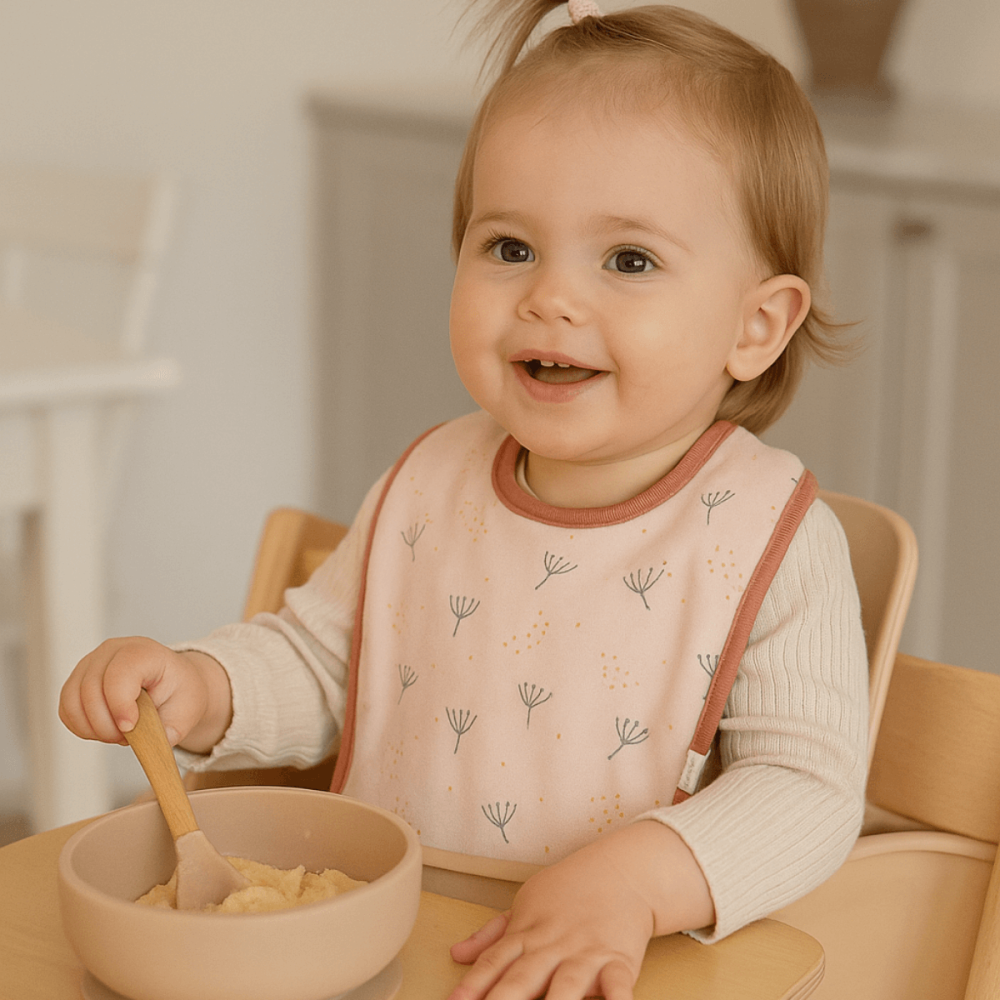 El babero cuenta con unos broches que se pueden adaptar a las diferentes tallas de los peques. En la web podrás encontrar más productos de esta divertida colección de diente de león con los que combinar este babero; vajilla, cambiador impermeable para bebé, neceser, mini mochila o la botella térmica con boquilla de recambio.