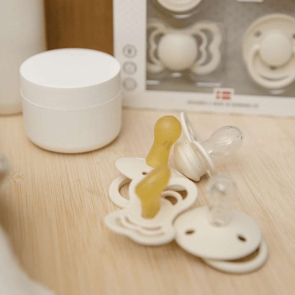 Pack de 2 chupetes de la marca Bibs de la colección Supreme látex. Es un chupete de ventila, lo que significa que bebé aprieta el aire fuera del chupete mientras es usado.