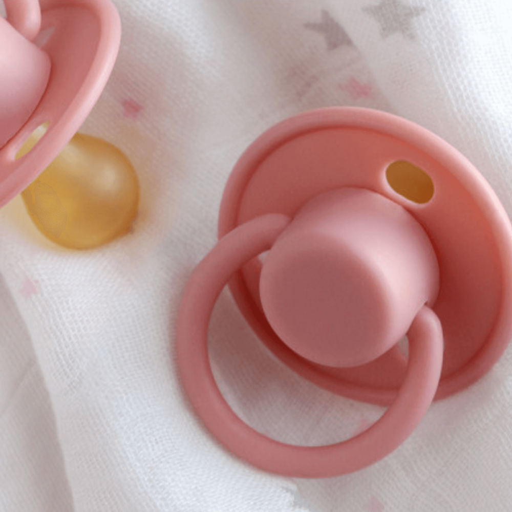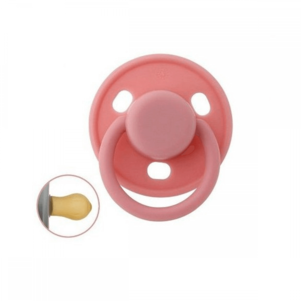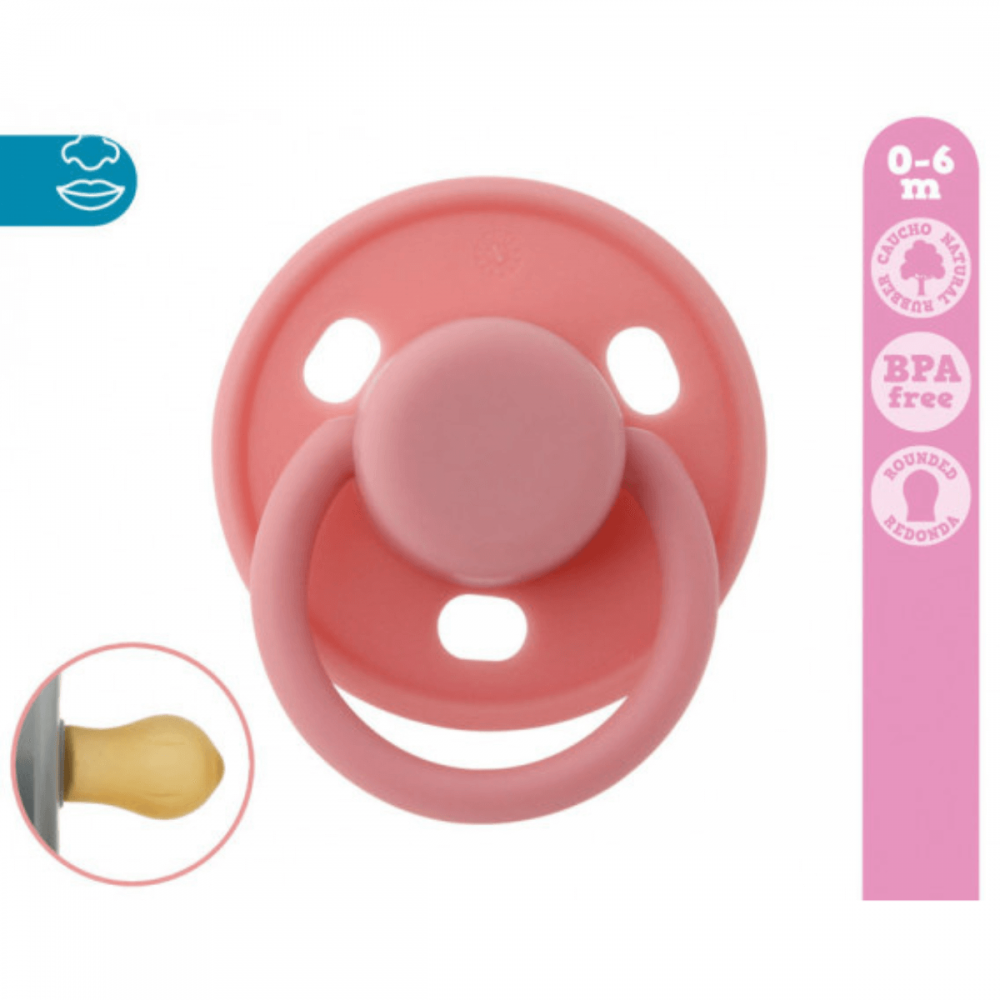 Chupete retro redondeado en color rosa con tetina de látex de la marca Kiokids.