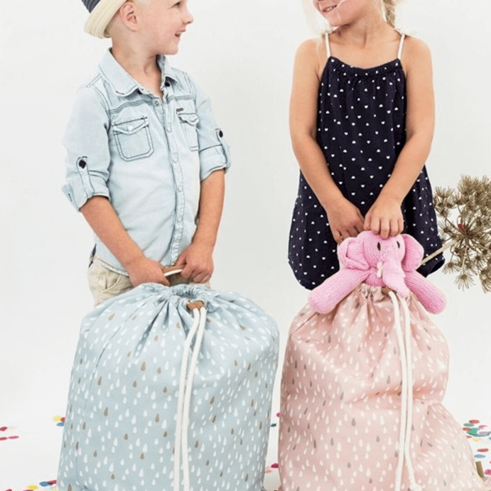 Ordena la habitación de tu peque o su cuarto de juegos con este saco juguetes de Fresk en color rosa de la colección gotas. ¡Además puedes personalizarlo!