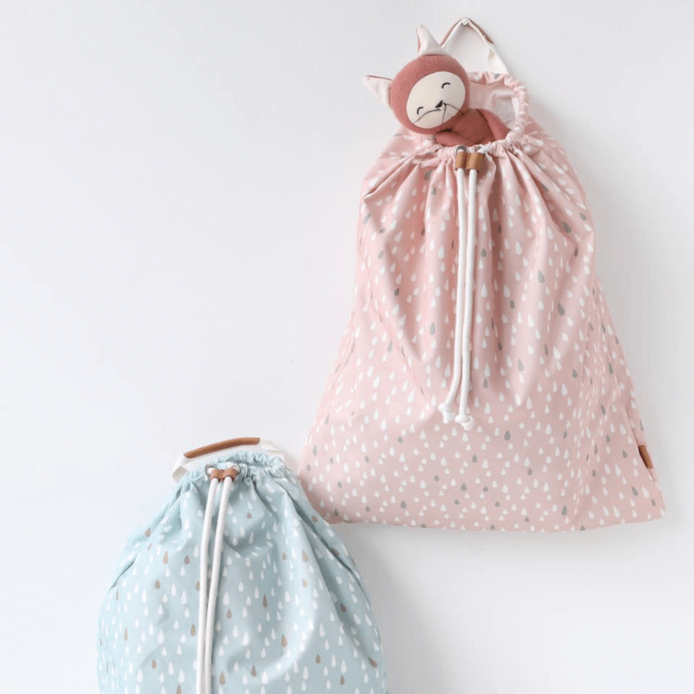 Saco juguetes ideal para tenerlos siempre organizados de la marca Fresk en color rosa con bonito diseño de gotas de agua. ¡Personalizable!