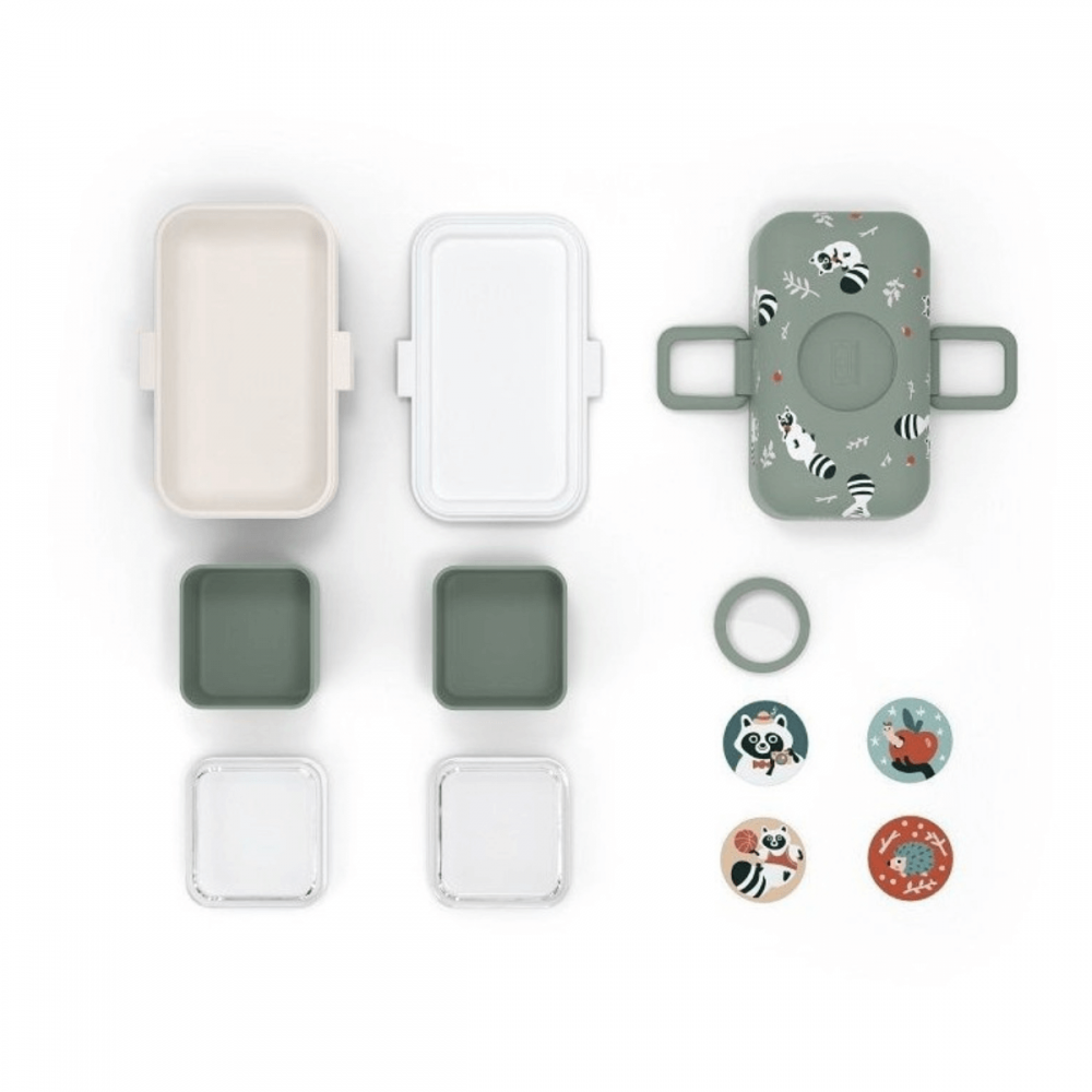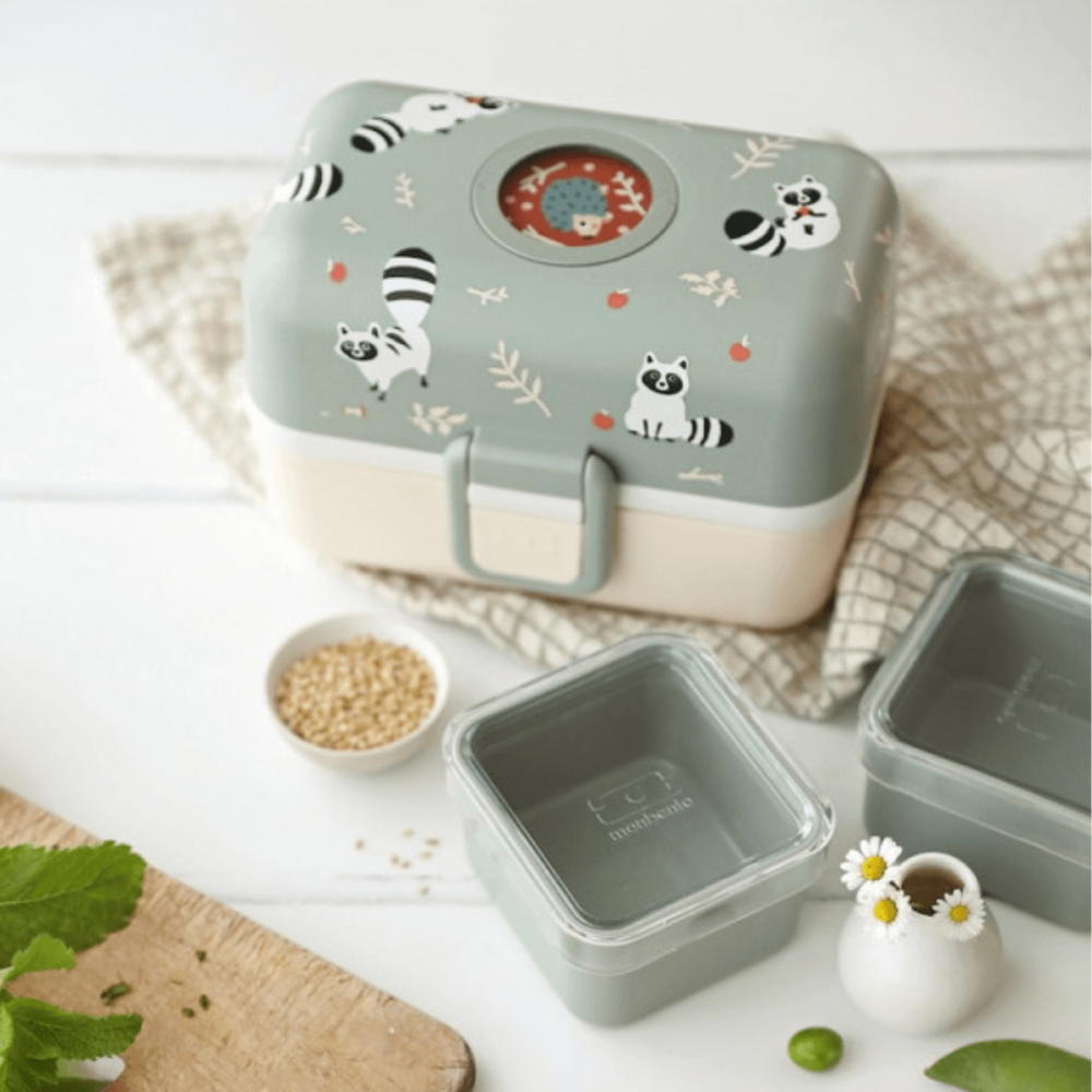 Caja de Monbento de la colección Tresor Mapache. Tiene varios compartimentos donde poder llevar la comida separada y tapitas para poder personalizarla con el nombre.