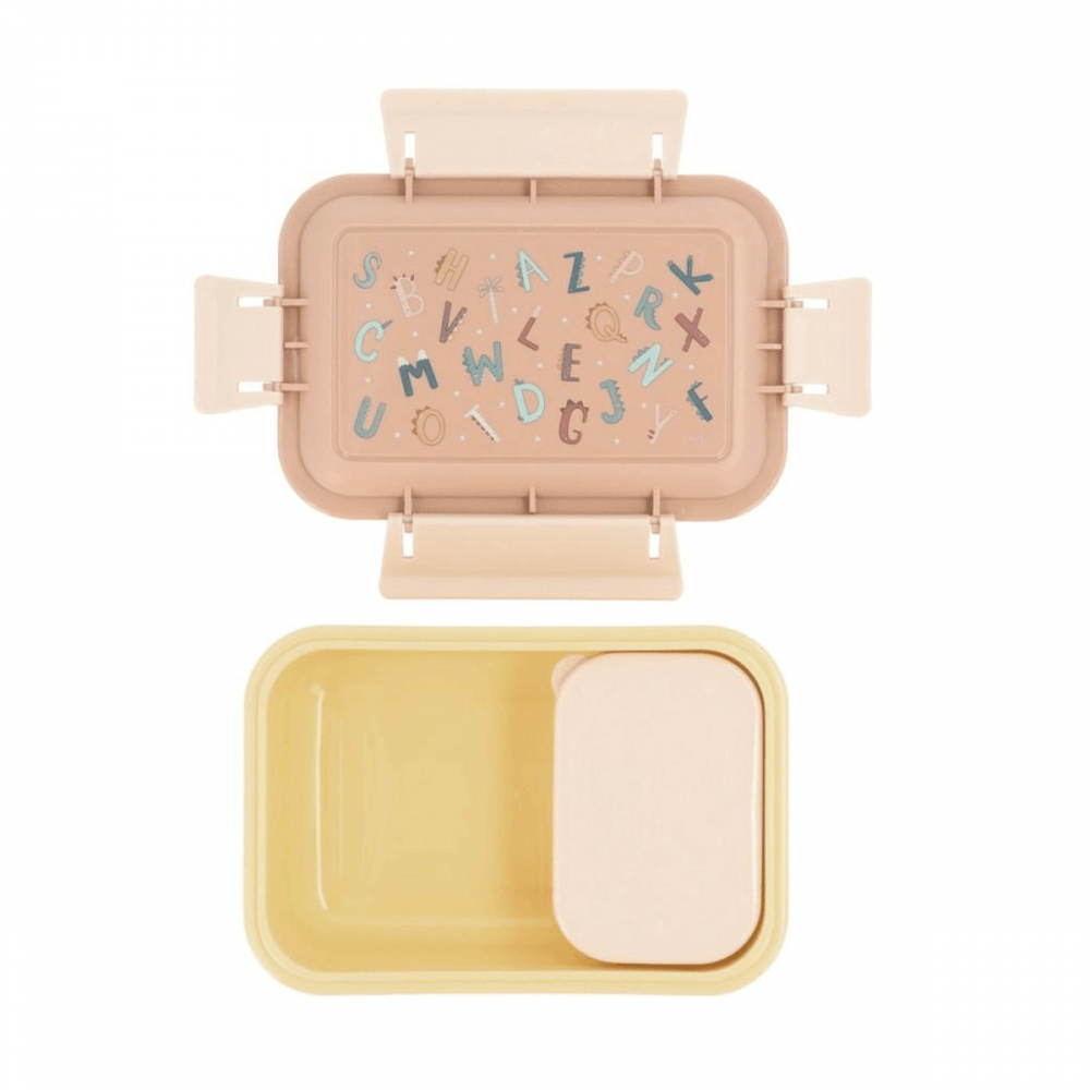 Caja almuerzo Bento de la colección Funny Letters Personalizable de Tutete. Incluye tenedor y cajita interior. Ideal para el colegio o la guardería.