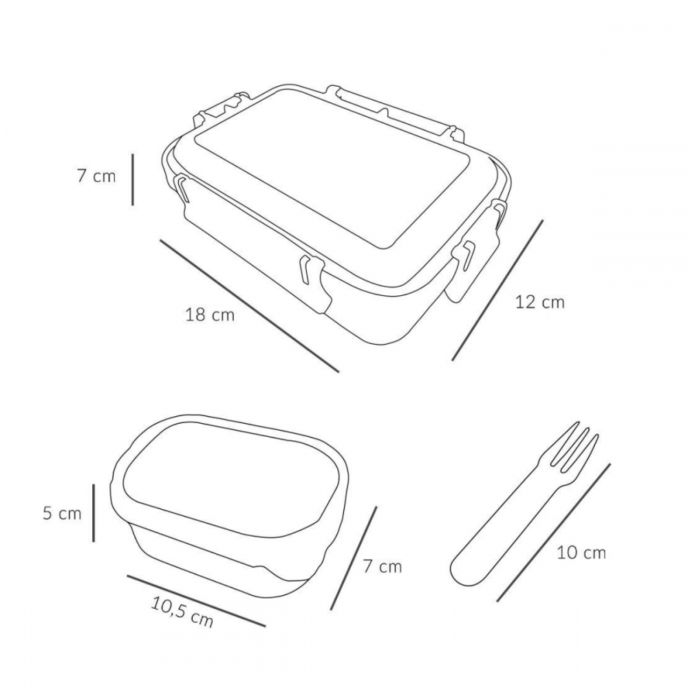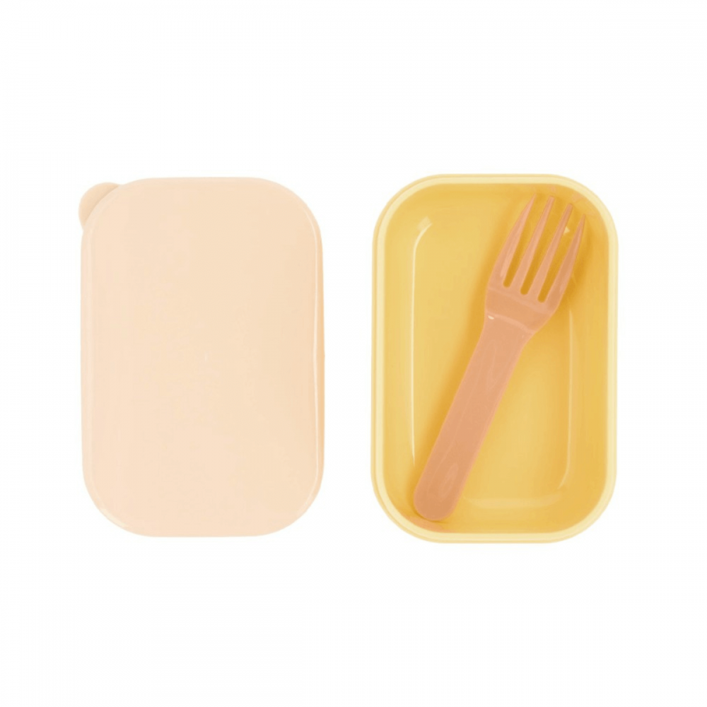 Incluye una cajita interior extraíble para separar alimentos y un tenedor reutilizable a juego, perfecto para fruta, galletas o snacks saludables.