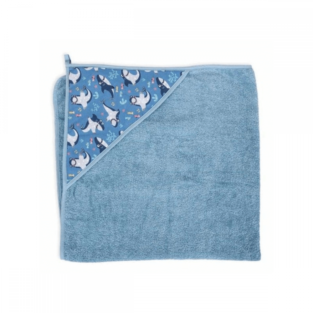 Toalla azul Shark de Cebababy confeccionado con fibras de algodón que absorben eficazmente toda la humedad que puedan tener los pequeños tras su baño.