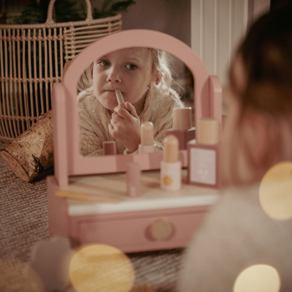 Tocador de maquillaje de juguete con espejo giratorio en madera con muchos accesorios también en madera de la marca Little Dutch.