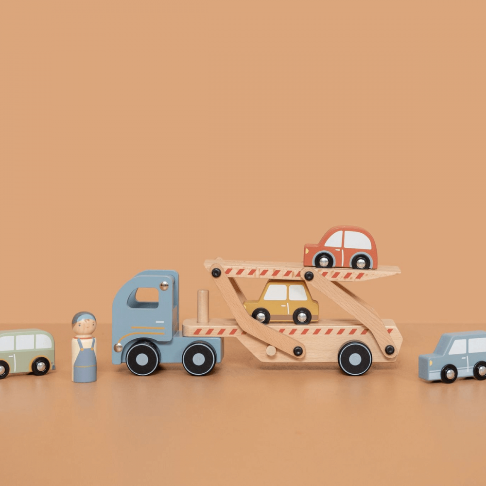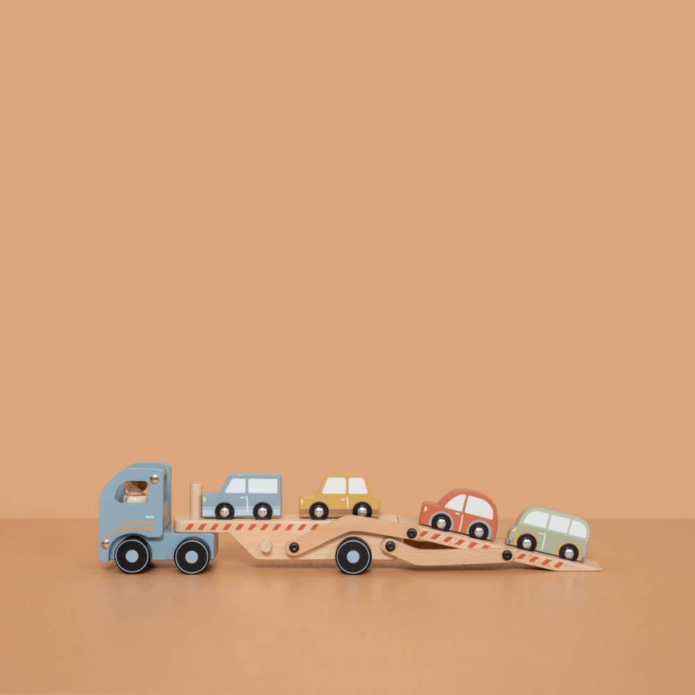 Camión Transporte de Coches juguete en madera de la marca Little Dutch. Este juguete incluye un conductor y cuatro coches. Despliega el remolque y los coches podrán arrancar.