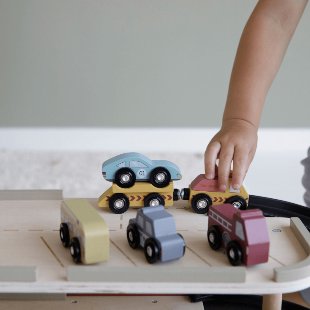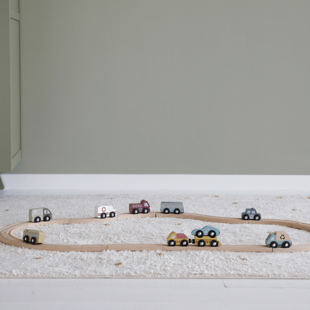 9 Vehículos de la marca Little Dutch. Puedes completarlos el resto de juguetes de la colección Sistema de Trenes de Little Dutch. ¡Variedad de coches de juguete para disfrutar! Crea tu propia colección de coches de madera.