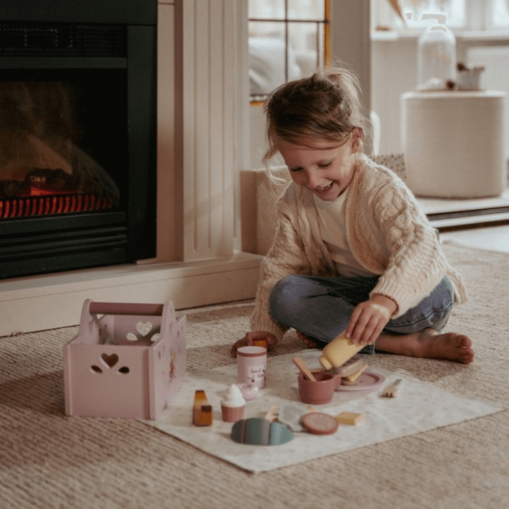 Completa cesta de picnic juguete de color rosa, fabricada en madera de Little Dutch, que cuenta con 31 piezas.
