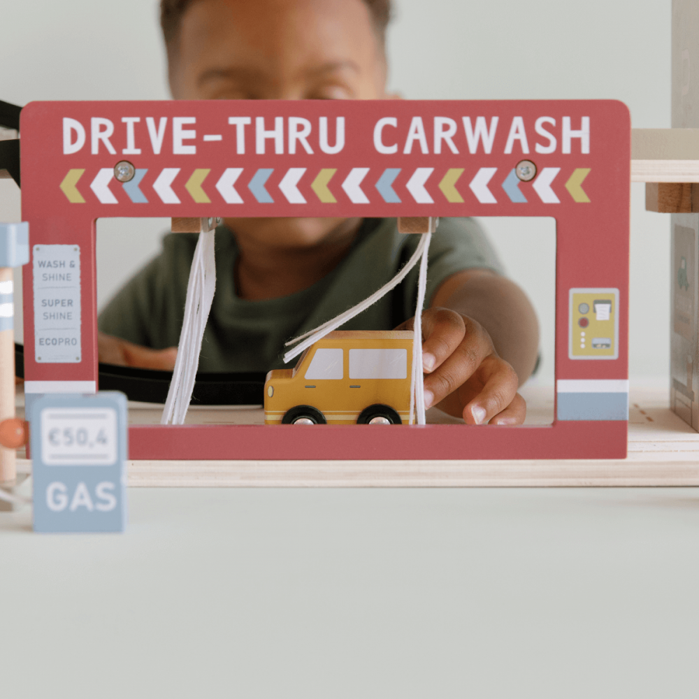 Parking de juguete con muchos accesorios. Es de la marca Little Dutch de la colección sistema de trenes.