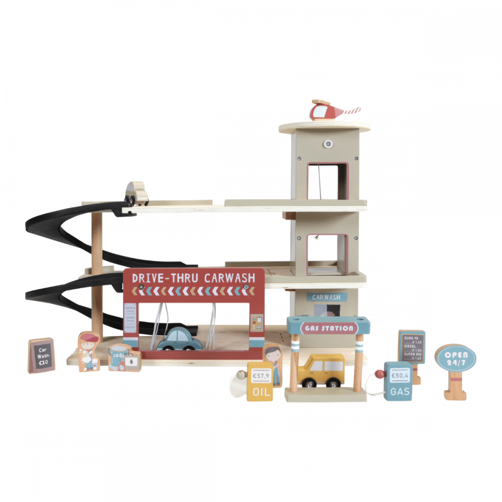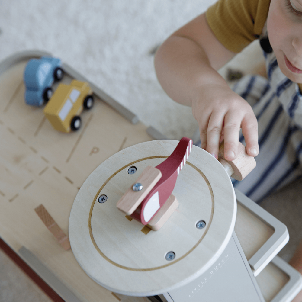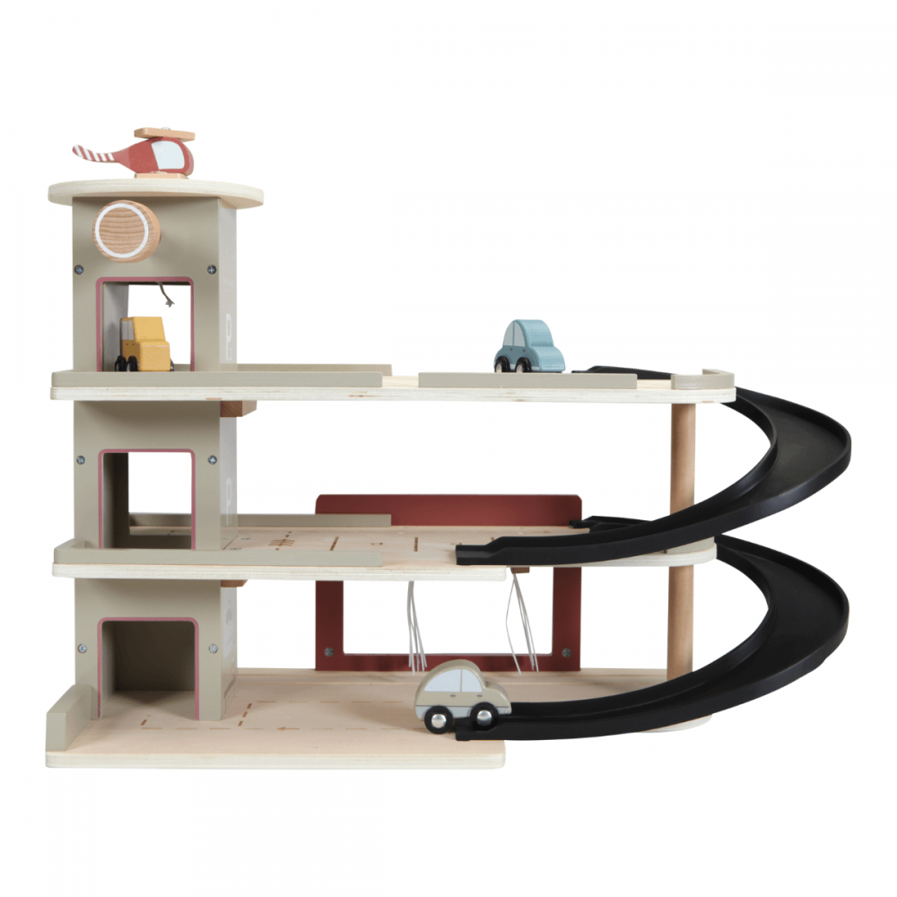 Parking de juguete en madera de Little Dutch. Este Precioso garaje cuenta con un helipuerto en la parte superior, un ascensor para subir y bajar coches, rampas, estación de servicio y con vehículos, figuras y helicóptero incluidos. Además tienes en la web muchos juguetes con qué poder completarlo.