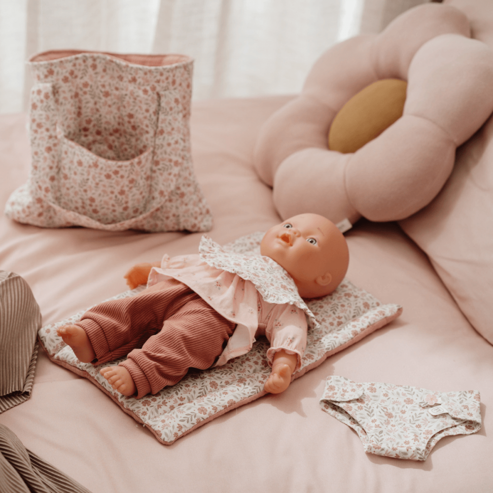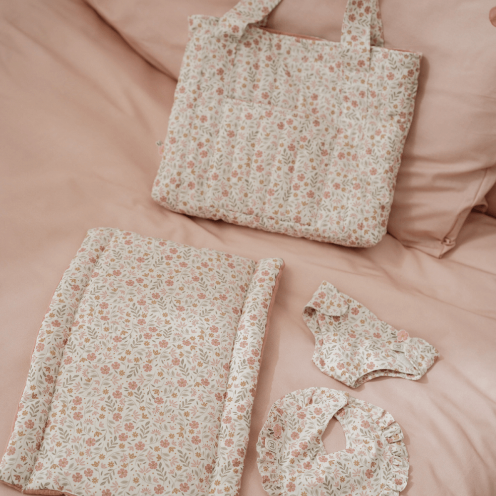 Esta bolsa para el cuidado de sus muñecas es ligera, práctica y con un precioso estampado floral en tonos suaves, esta bolsa contiene todo lo necesario para que los niños y niñas cuiden de sus muñecas como si fueran bebés de verdad.