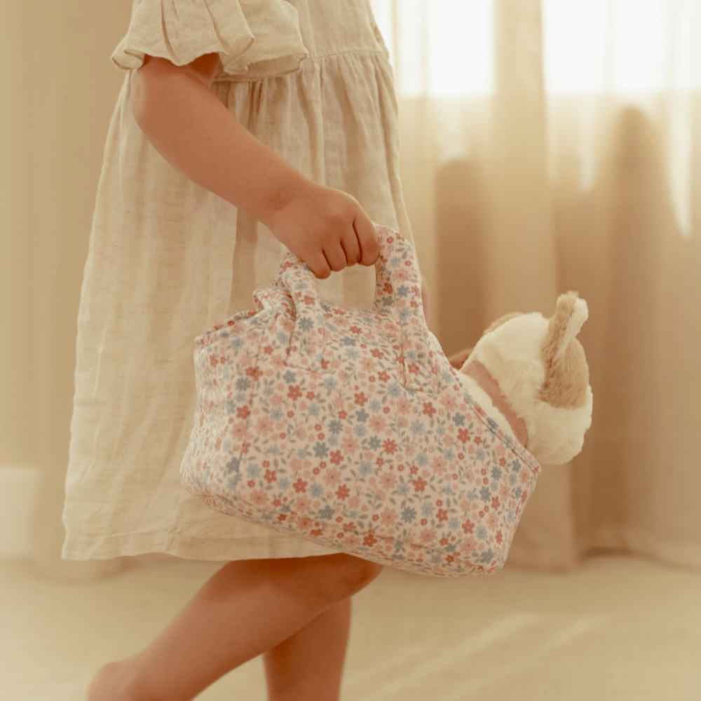 - Bolso de tela con estampado floral, perfecto para llevar al gatito de paseo.