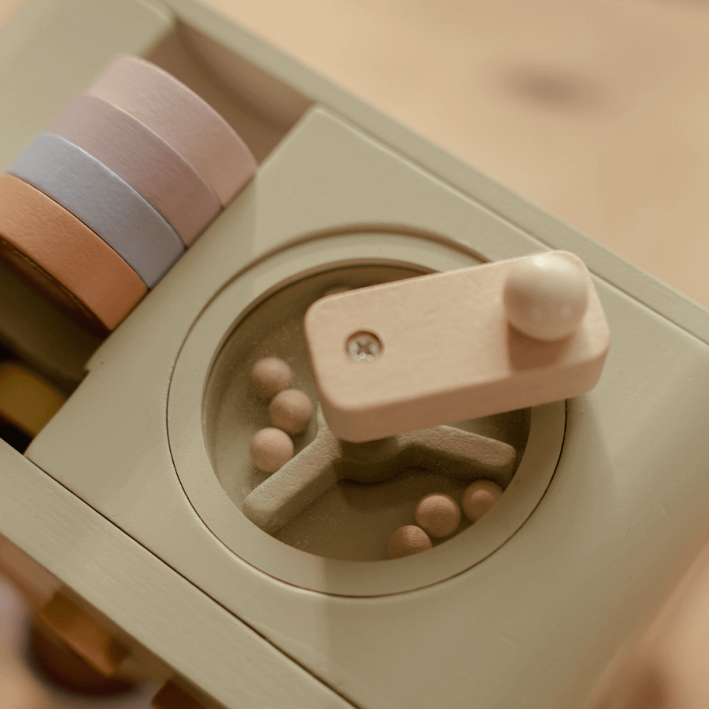 Sus juguetes de madera son el sello más distintivo de la firma: trenes, cocinitas, encajables, instrumentos musicales, juegos de equilibrio o pistas de coches, todos elaborados con materiales sostenibles y pinturas al agua seguras para los niños. Cada pieza está pensada para estimular la imaginación, la motricidad y el aprendizaje a través del juego libre.