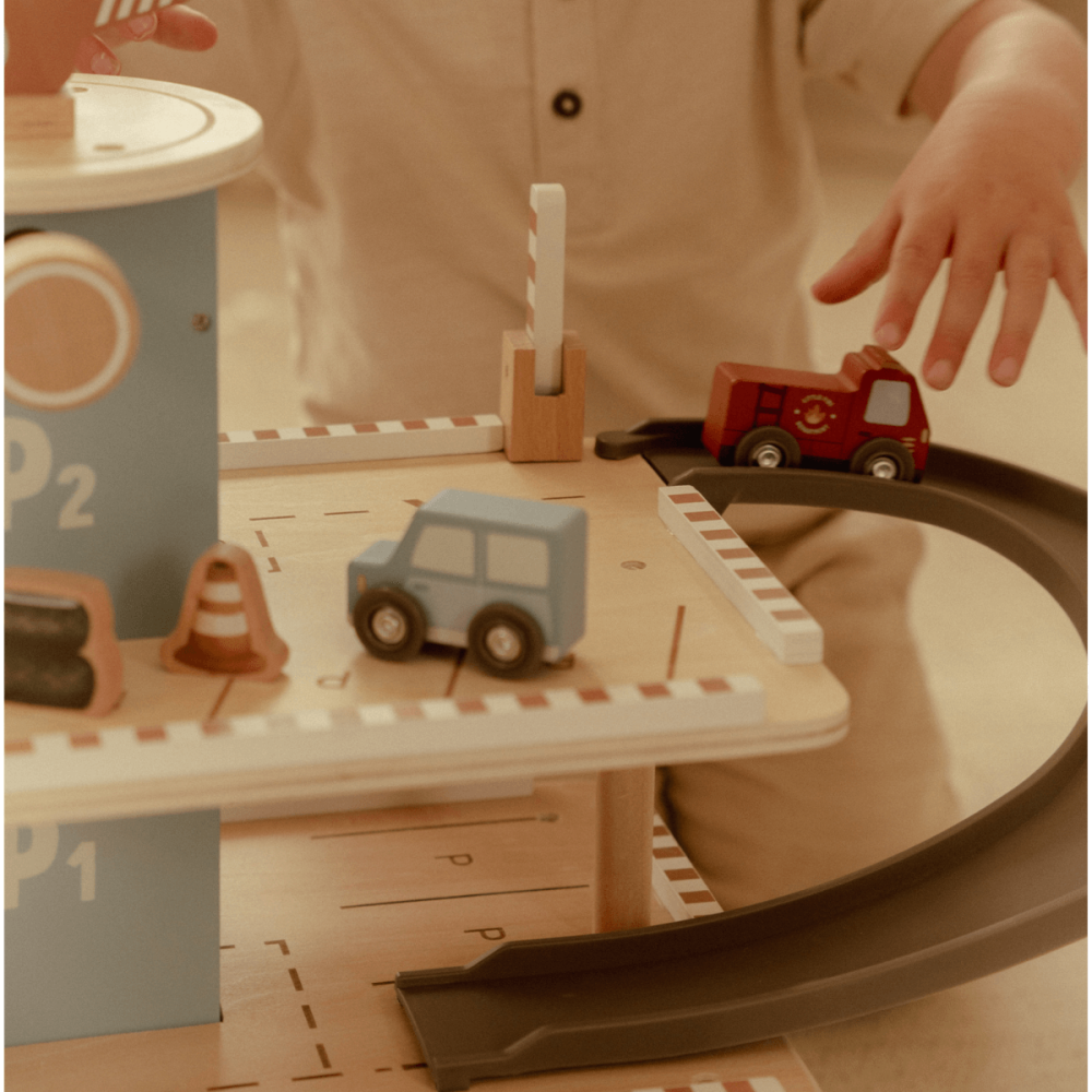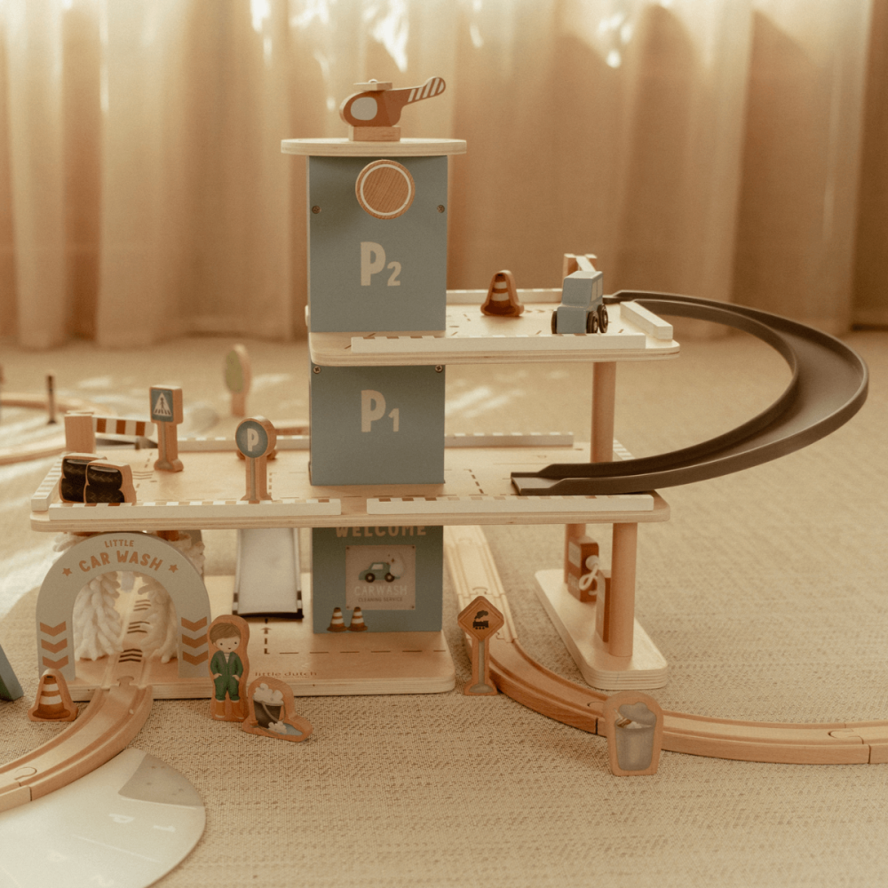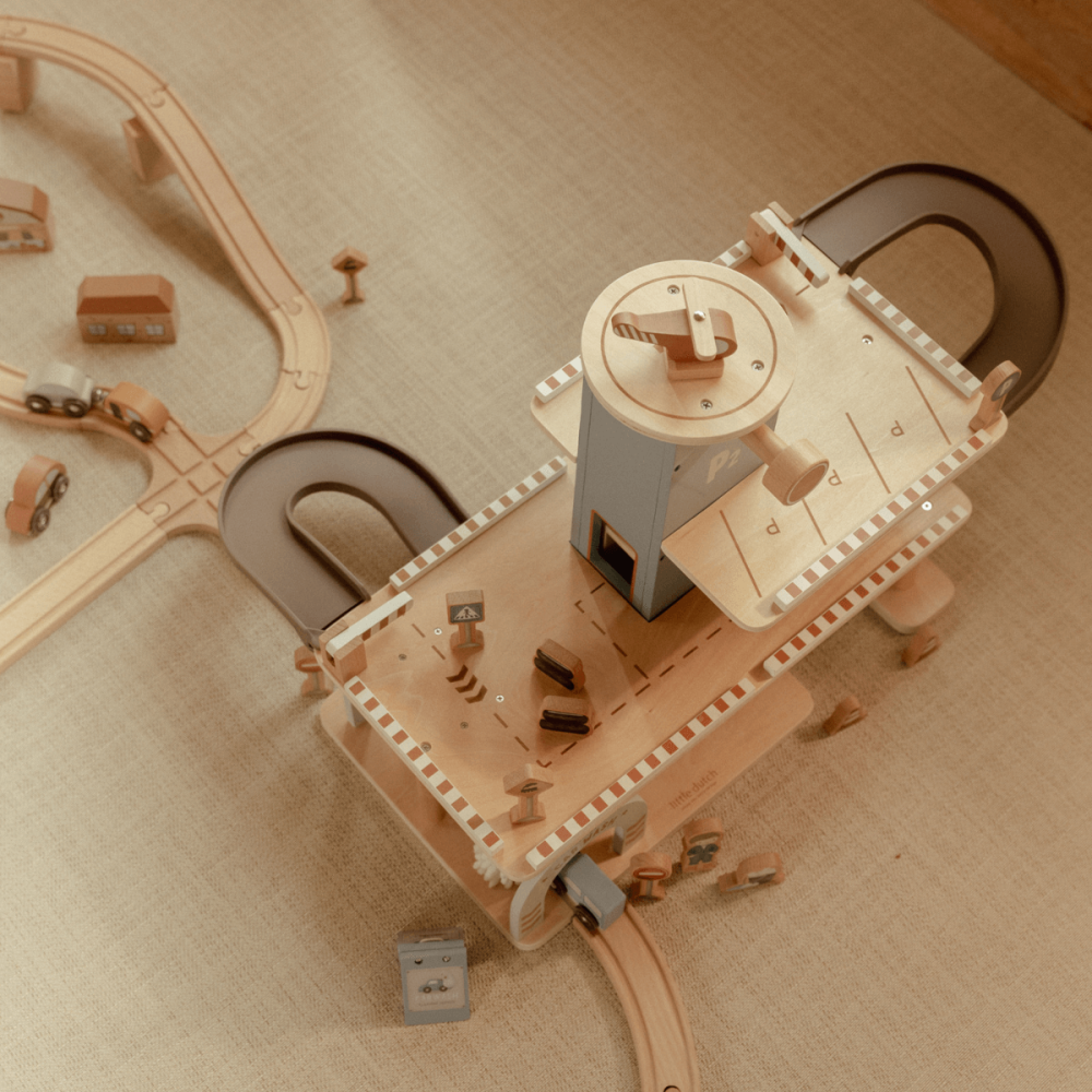 Su diseño resistente y sus colores suaves —en tonos azul empolvado, gris y madera natural— lo convierten en un juguete atemporal, decorativo y duradero, perfecto para acompañar al niño durante años. Además, es totalmente compatible con la vía de tren XL de Little Dutch y muchos otros juguetes, lo que permite ampliar la ciudad y conectar el garaje con otros escenarios, potenciando aún más la creatividad.