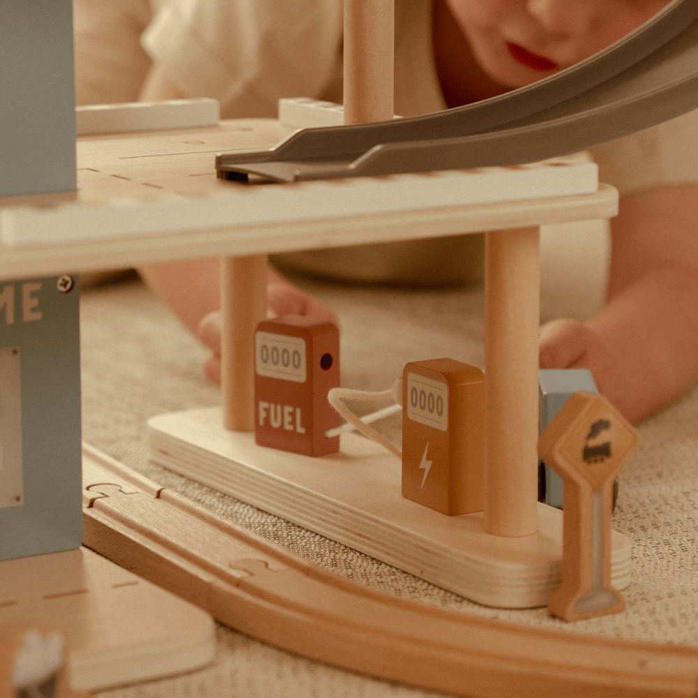 ¡Aparca, recarga combustible y corre hacia nuevas aventuras! El garaje de madera de Little Dutch es el complemento perfecto para el Set de Tren XL, aunque también puede disfrutarse como un juguete independiente lleno de acción, imaginación y aprendizaje.