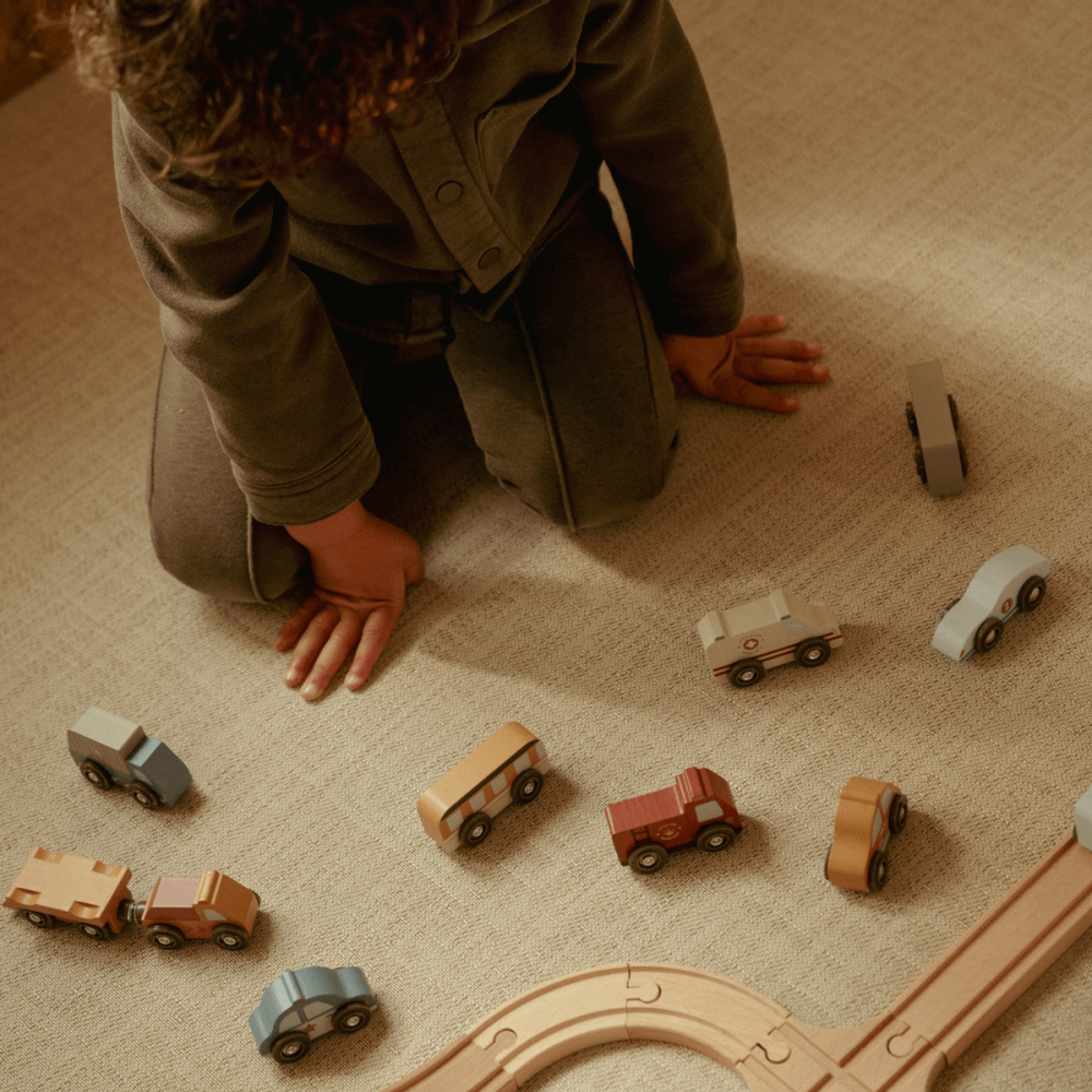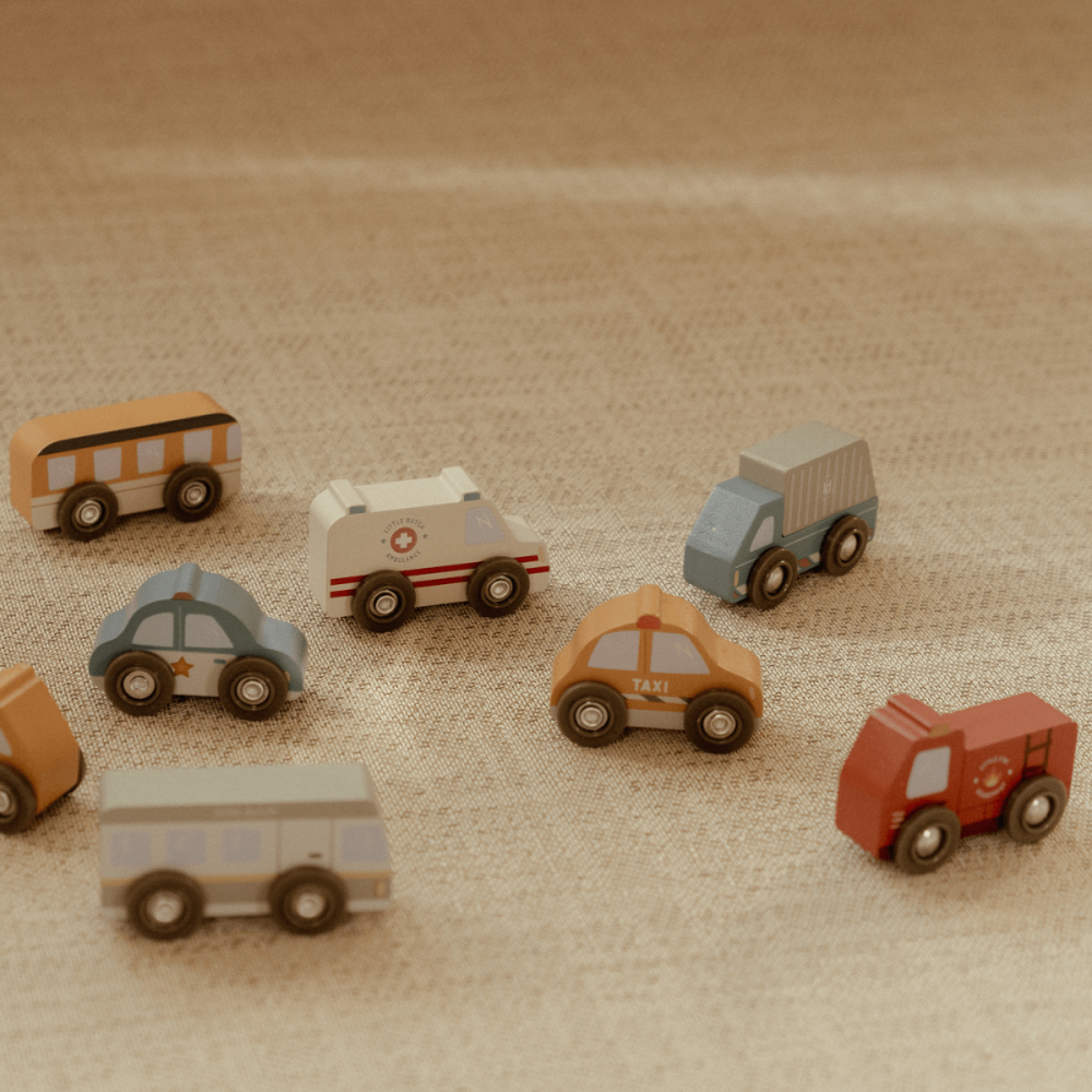 Juguete set de vehículos de Little Dutch de madera. Incluye coches, camiones y ambulancia. Compatible con tren XL. Desde 2 años.