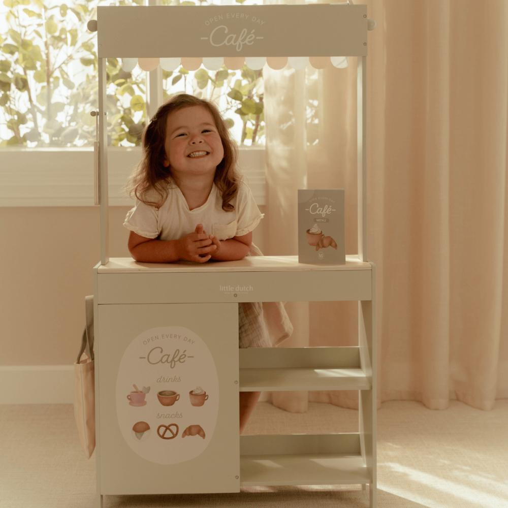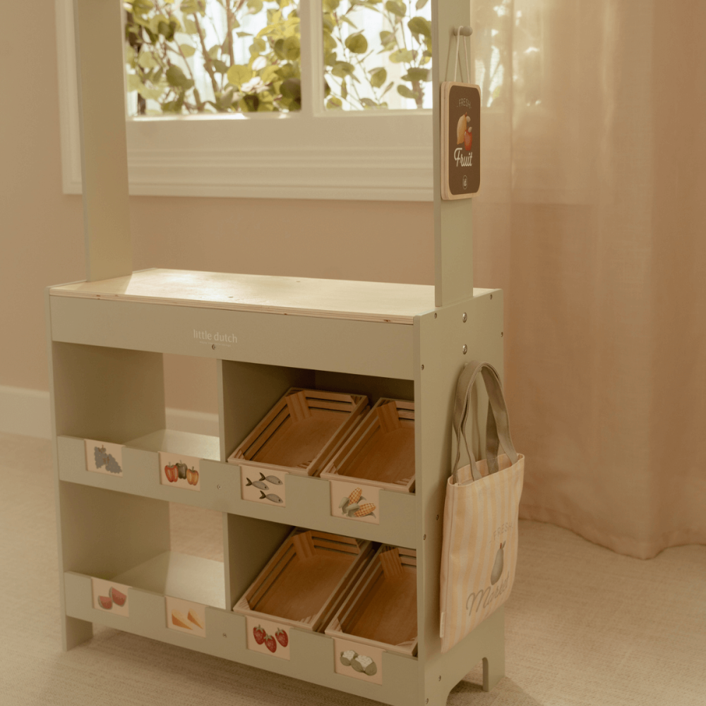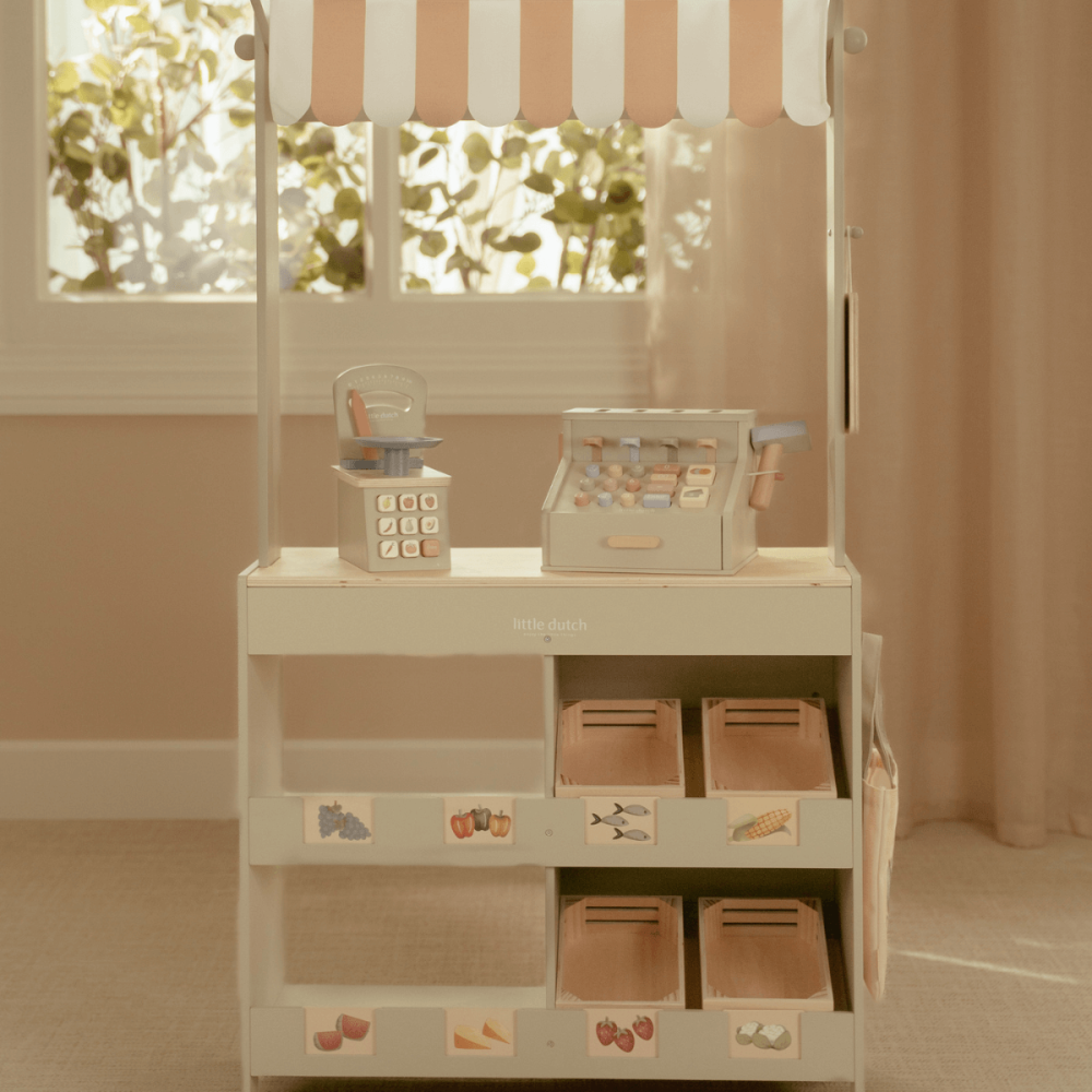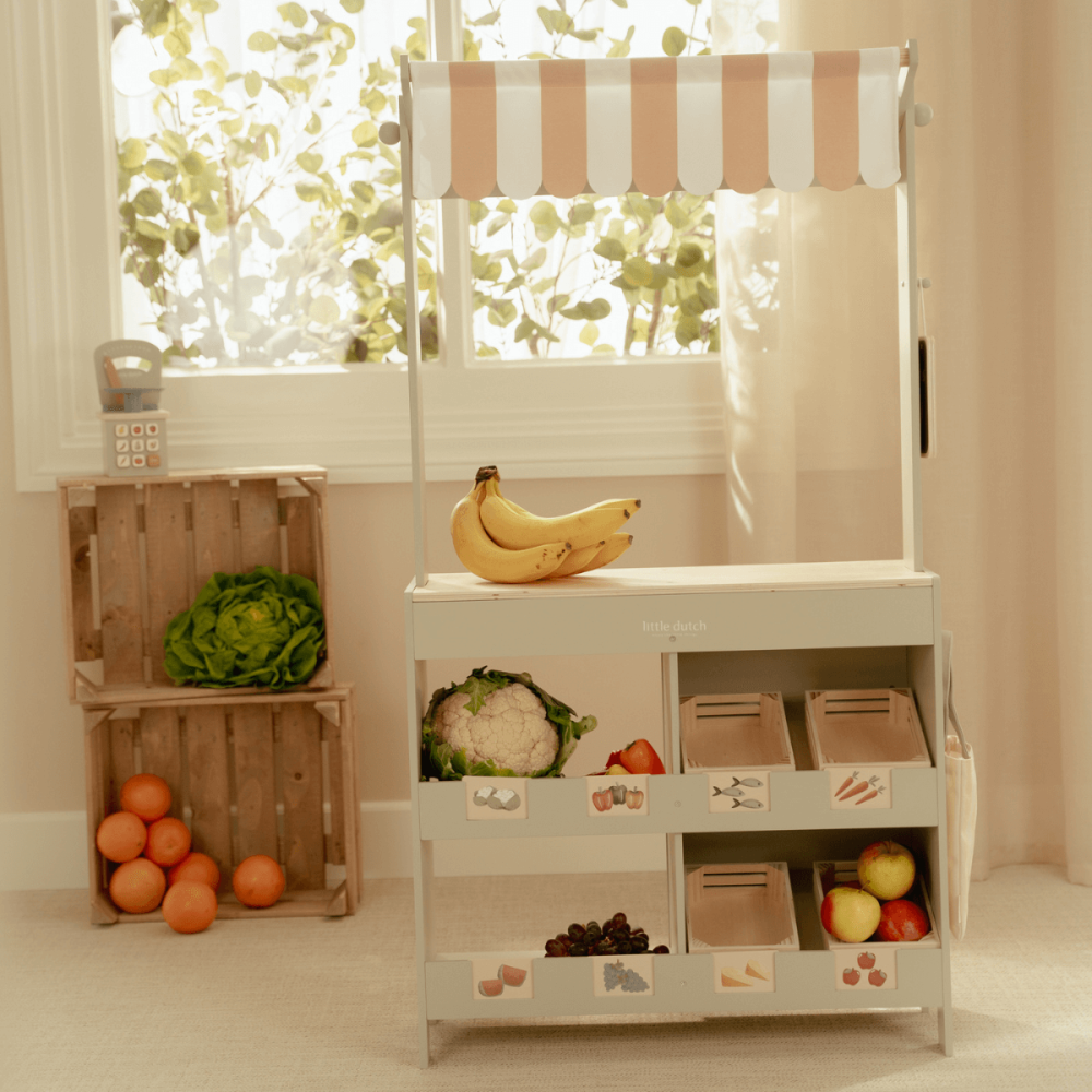 A partir de los 3 años, los pequeños empiezan a reproducir situaciones del día a día con mayor detalle, creatividad y autonomía. El puesto Little Dutch es perfecto para acompañar esta etapa porque ofrece múltiples posibilidades: vender frutas o verduras, organizar productos en cajas, anotar precios en la pizarra, colocar ilustraciones de los artículos disponibles, o darle la vuelta al puesto para convertirlo en una cafetería llena de encanto.