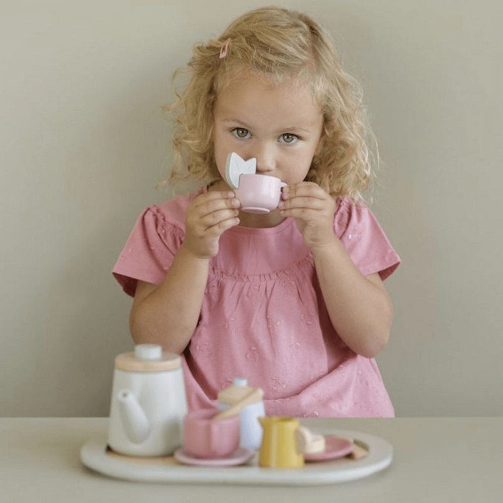 Set de te madera para dos de la marca Little Dutch. Consta de 12 piezas. Este juguete desarrolla la imaginación y creatividad porque anima al juego imitativo e imaginativo, estimula la capacidad narrativa, el juego de rol y las habilidades sociales.