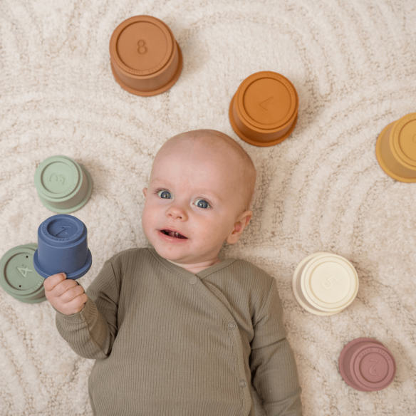 Los 8 vasos apilables tienen un número en la parte superior y encajan fácilmente entre sí para evitar que la torre se caiga. Su pequeño aprenderá sobre números y desarrollará habilidades motoras finas. Apile y cree la torre en un parque infantil, en el suelo o en la bañera o caja de arena. Gracias al material versátil se puede utilizar en cualquier lugar. Coloque las tazas pequeñas dentro de las más grandes para guardarlas fácilmente.
