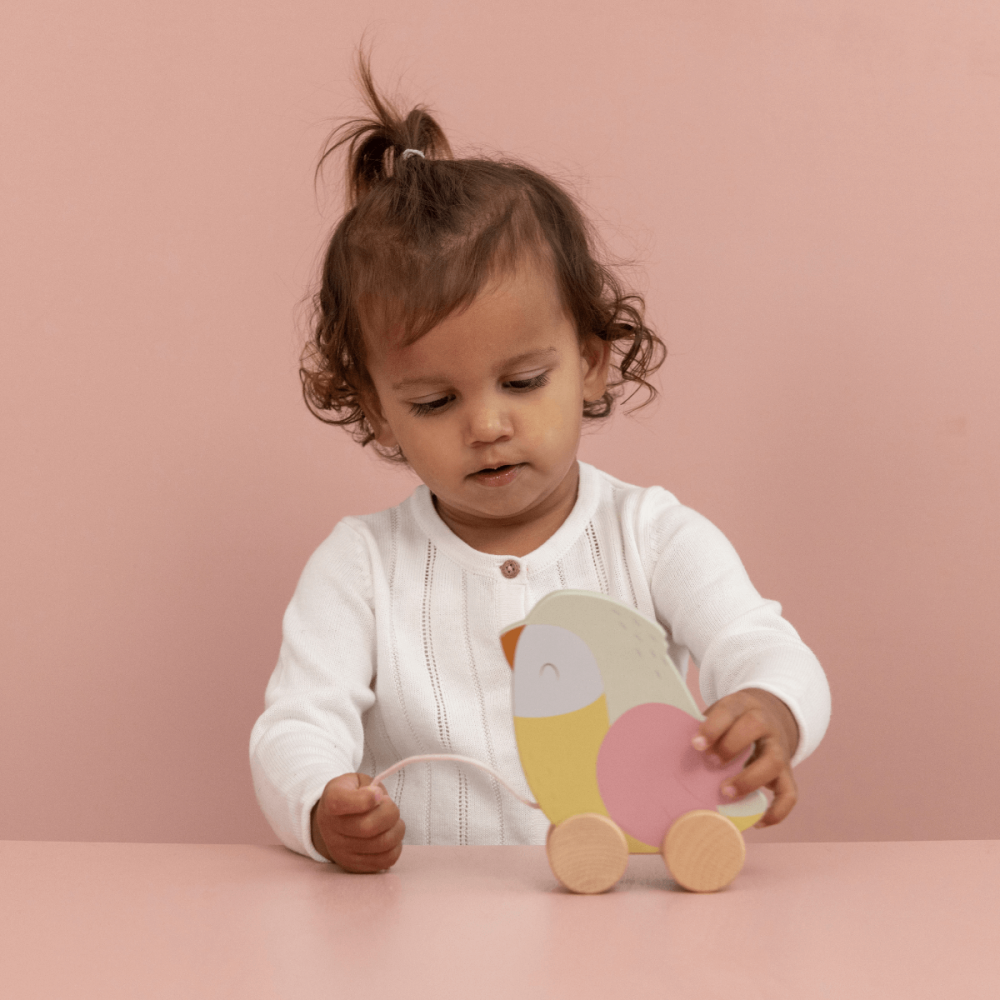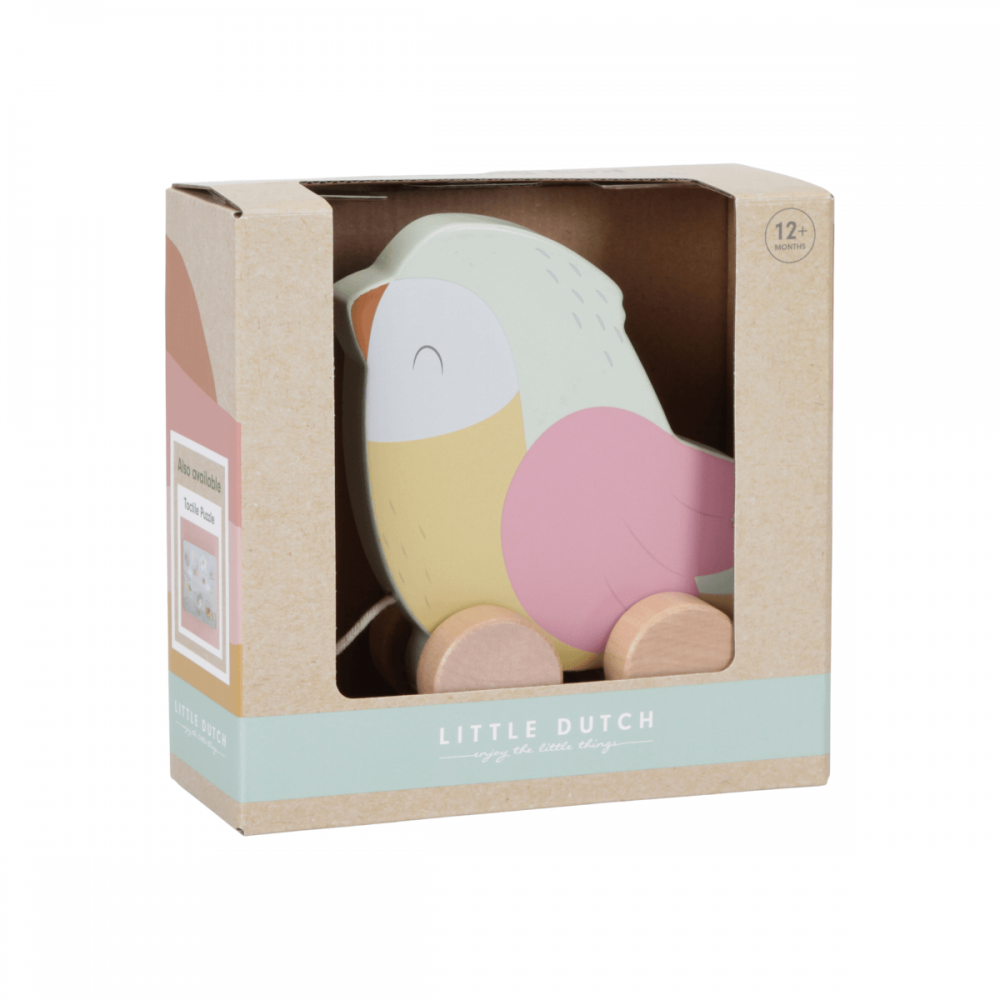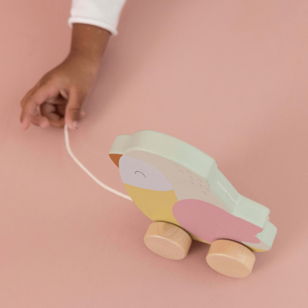 Arrastre Pajarillo de la colección Flores y Mariposas de la marca Little Dutch. Tira de la cuerda y el pequeño pajarillo seguirá a tu peque a todas partes.
