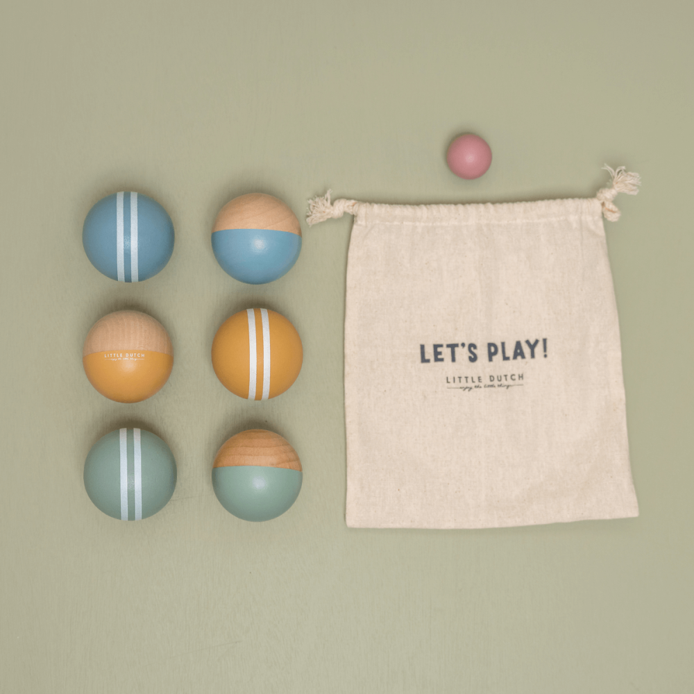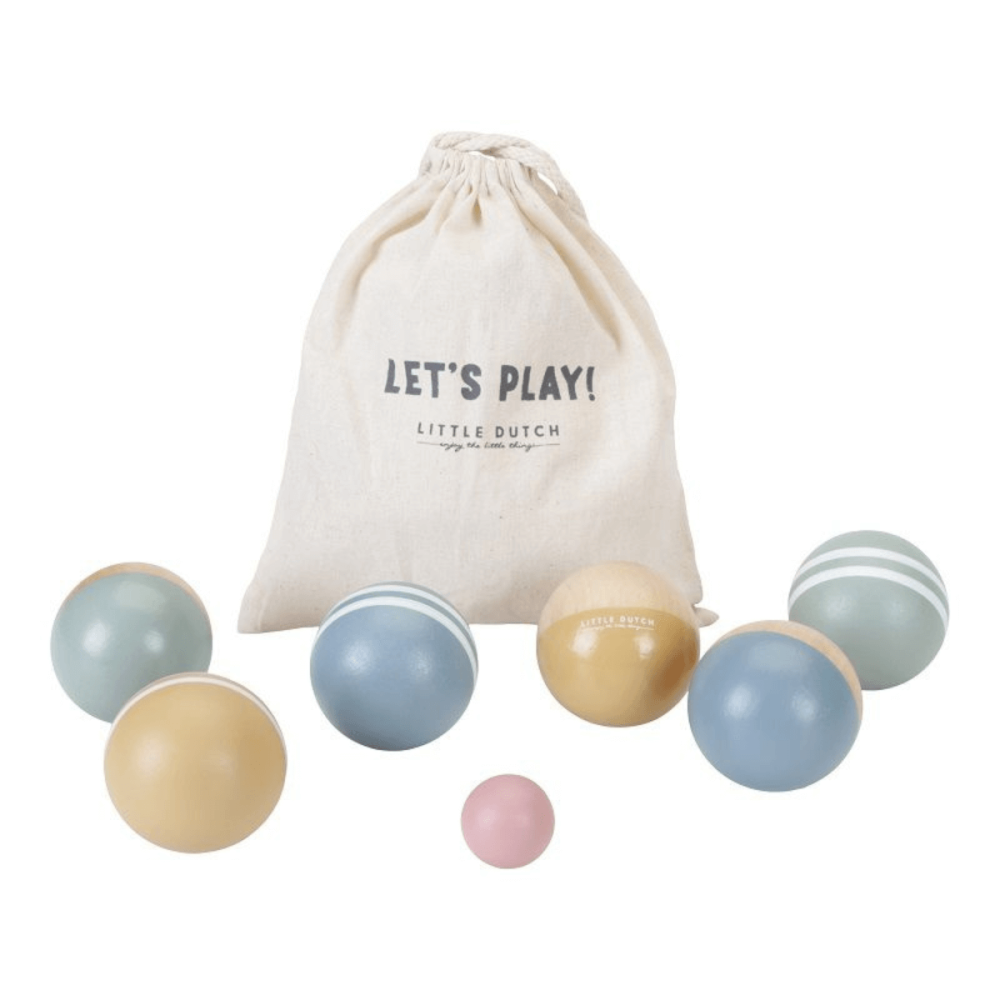 Este juego de bolas para niñas y niños es el clásico juego de la petanca. Un juguete ideal para el buen tiempo. La marca es Little Dutch.