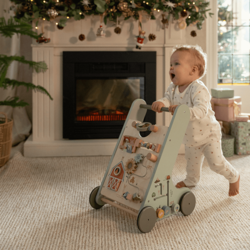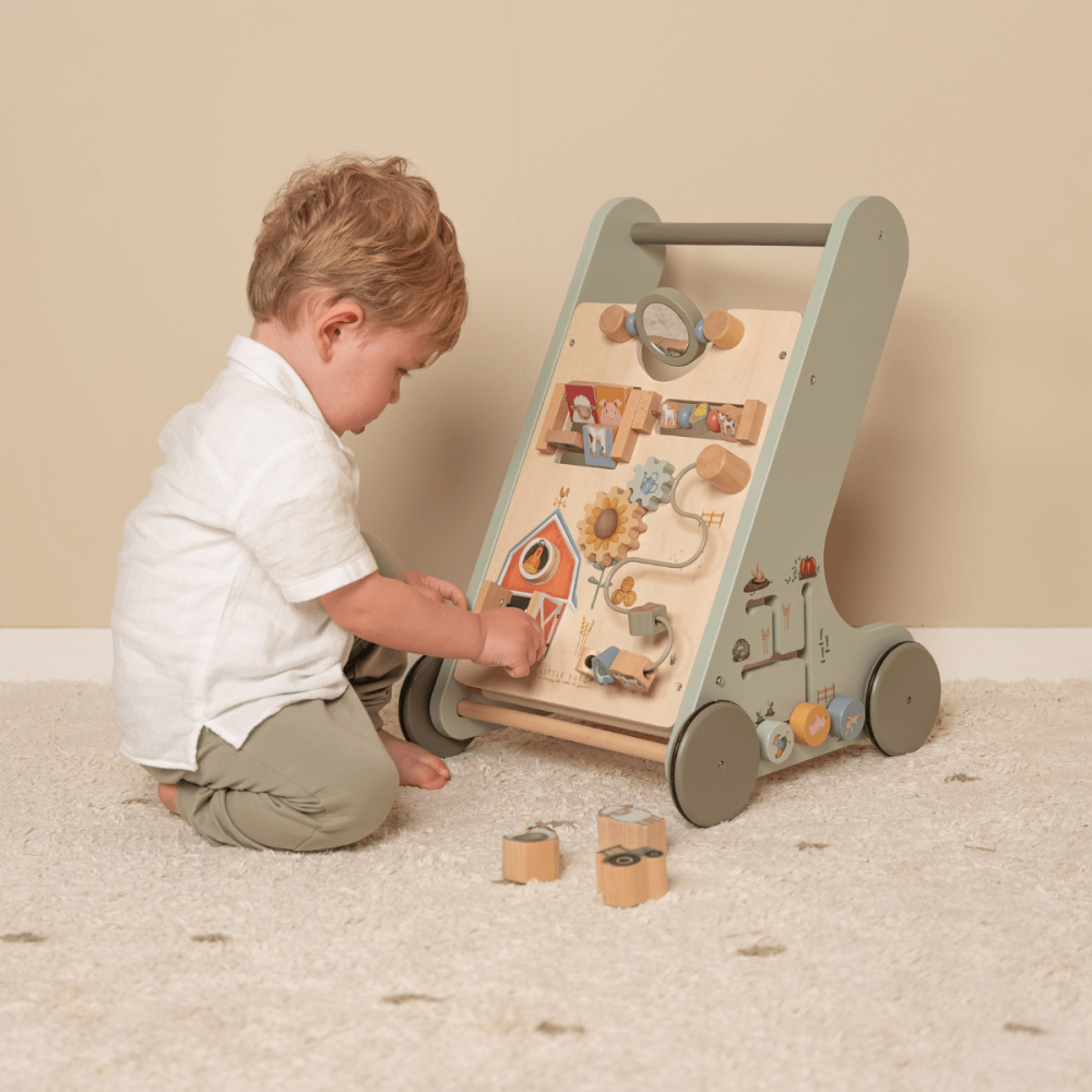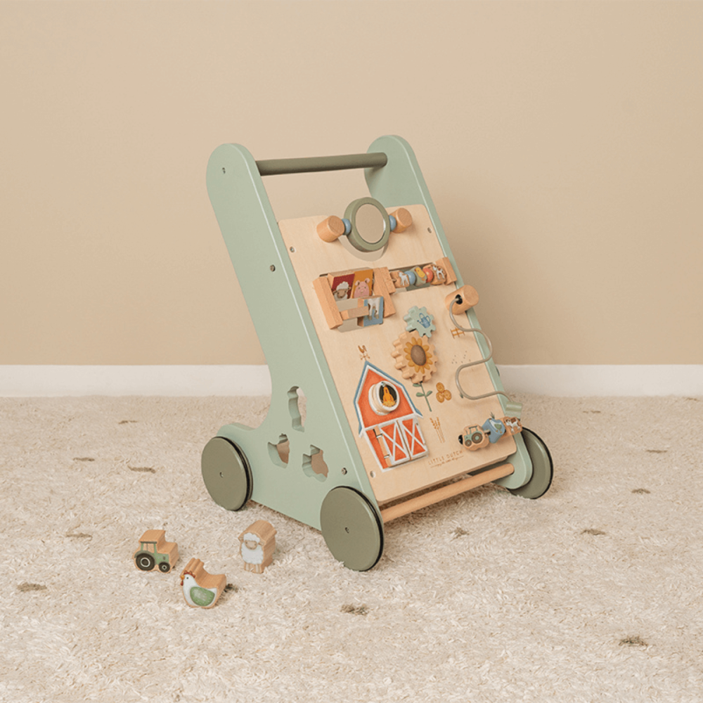 Este caminador de madera es de la nueva colección pequeña granja de Little Dutch. Tiene un montón de actividades que encantarán a tu niña o niño.