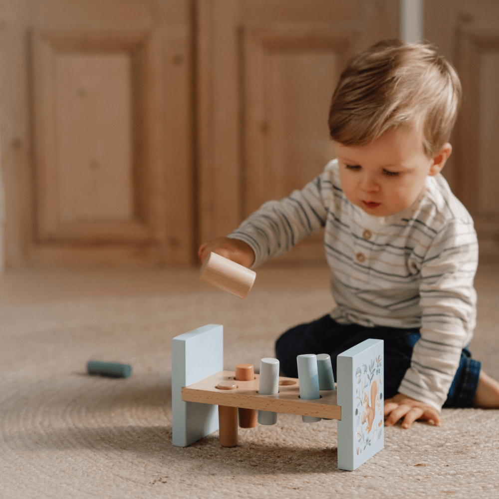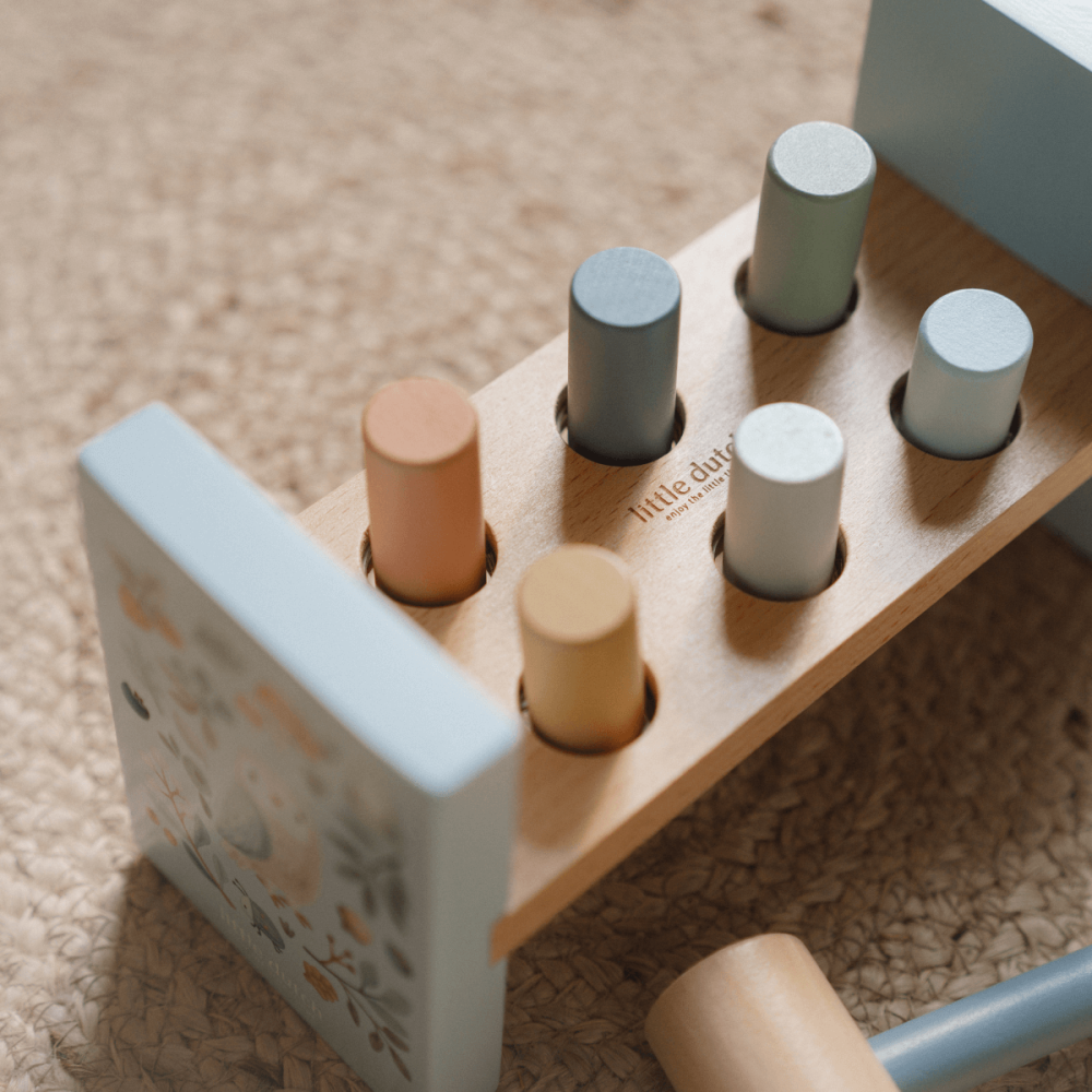 Banco de golpeo azul de madera Little Dutch. Estimula coordinación y motricidad. Diseño Forest Friends con colores suaves y martillo incluido.