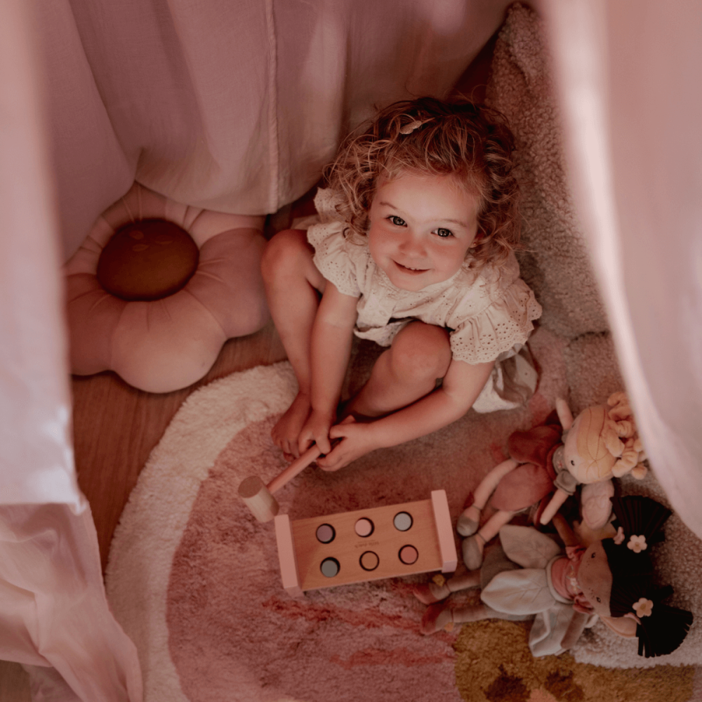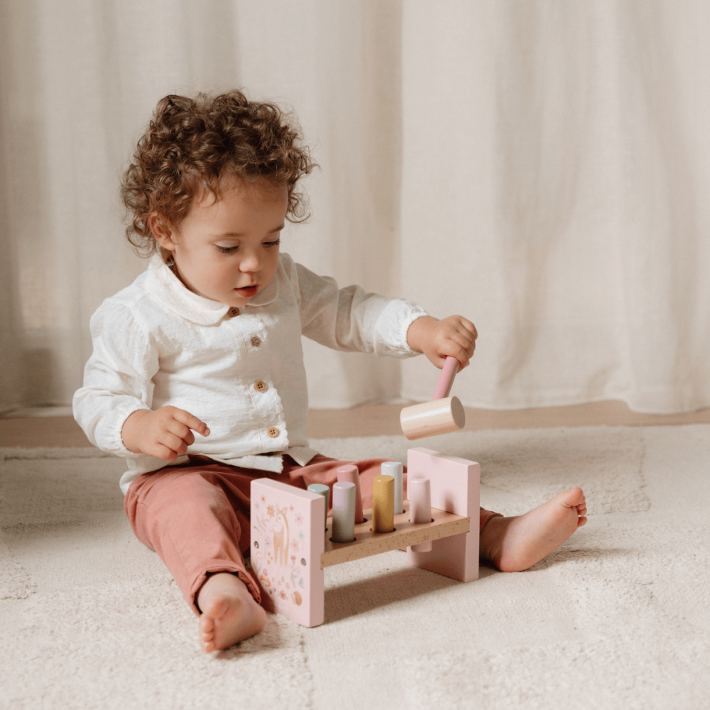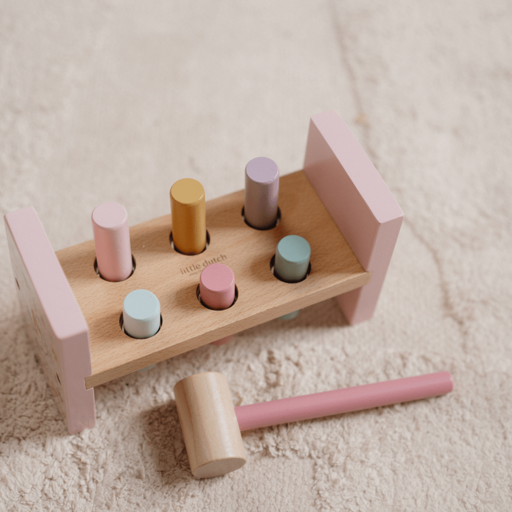El banco de golpeo rosa de la colección Fairy Garden de Little Dutch es un juguete de madera precioso y educativo que invita a los niños a aprender jugando.