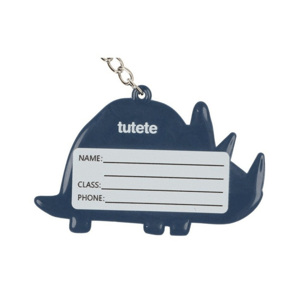 Llavero de silicona dinosaurio para el cole con los diseños de Tutete, para colgar en mochilas, estuches, abrigos y en el que podrás escribir los datos de tu peque en el reverso.