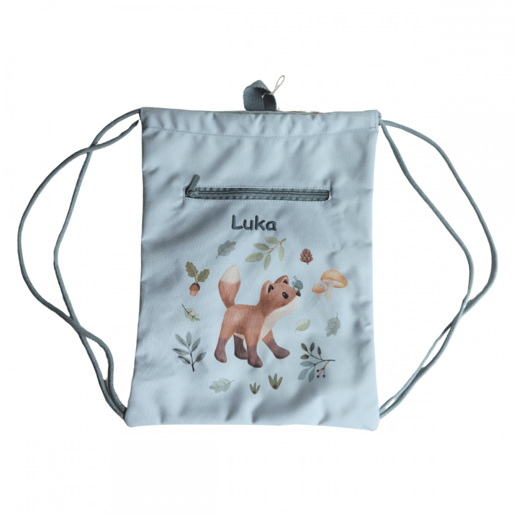 Mochila saco infantil personalizable ligera y práctica con diseño de zorrito. Ideal para colegio, guardería o actividades. Con bolsillo frontal y cierre de cordón.