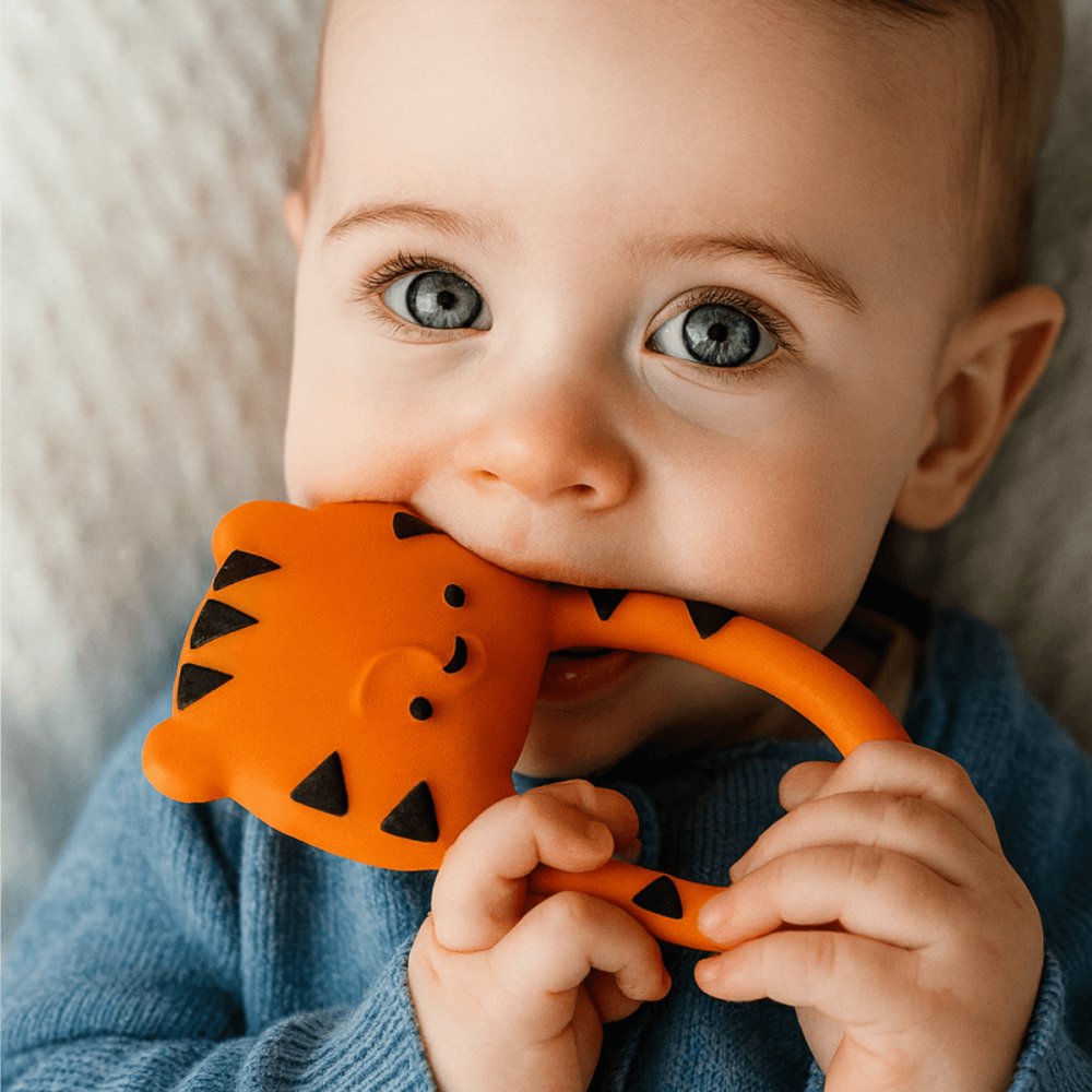 Mordedor sonajero de Lanco Nalu el Tigre. Es ideal desde recién nacido. Por su forma es muy fácil de agarrarlo.