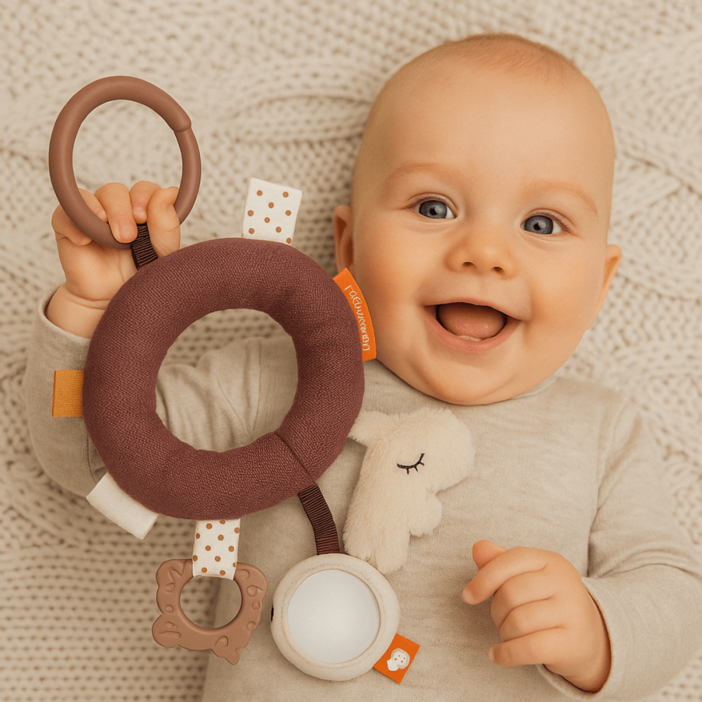 El anillo de actividades animará a los bebés a ser curiosos e investigar las características sensoriales: un mordedor suave para las encías que pican, un espejo con sonajero, un Ozzo de textura suave, sonidos de crujido y etiquetas divertidas.