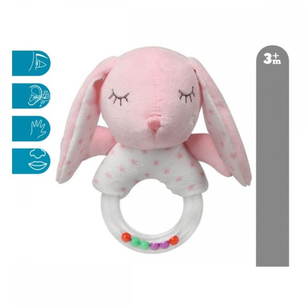 Sonajero anillo de peluche con forma de conejito en color rosa.