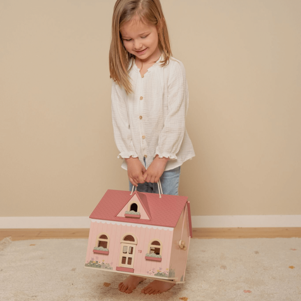 La mini casa de muñecas de madera portable de Little Dutch es una bonita y acogedora casa rosa con preciosos detalles.