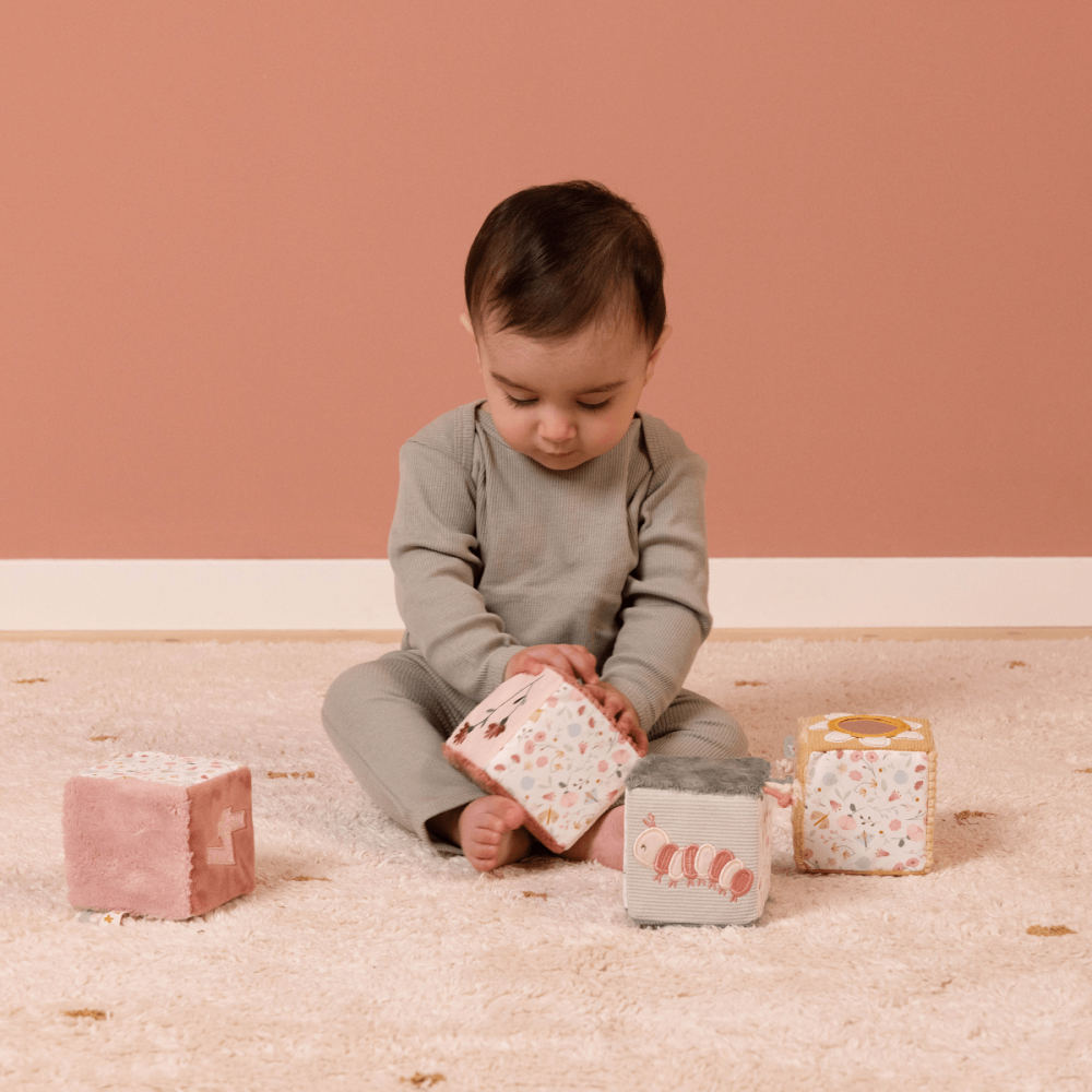 Cubos blanditos apilables para bebé de la colección Flores Y Mariposas de la marca Little Dutch. Diferentes colores, texturas, números para explorar.