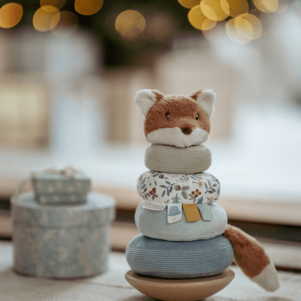 Apilable de anillos de peluche con un zorrito y base balancín de Little Dutch. Estimula la motricidad desde 12 meses.