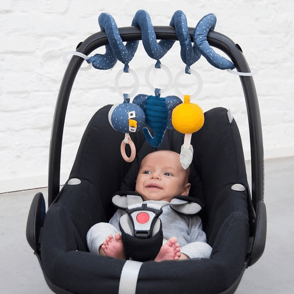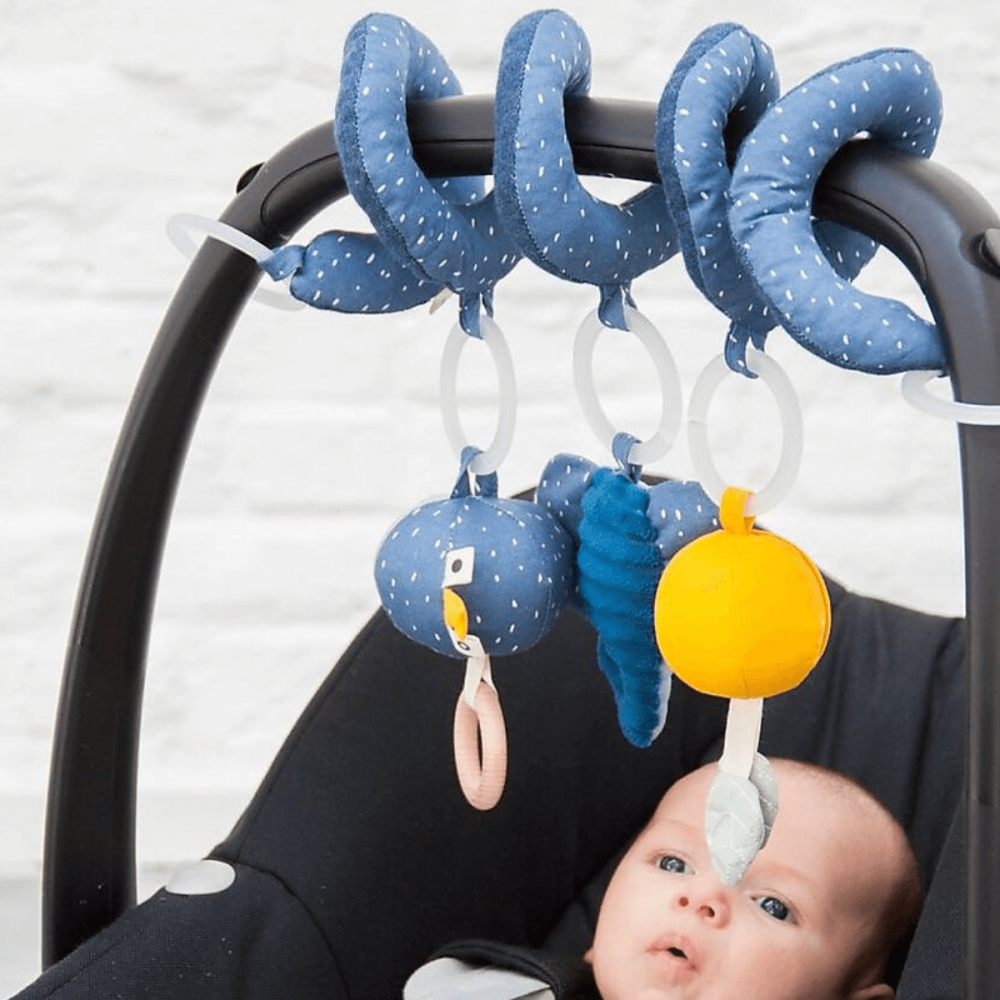 ¡Este juguete espiral de actividades da color al día! Lo enrollas sin problema en cualquier silla de coche o paseo.